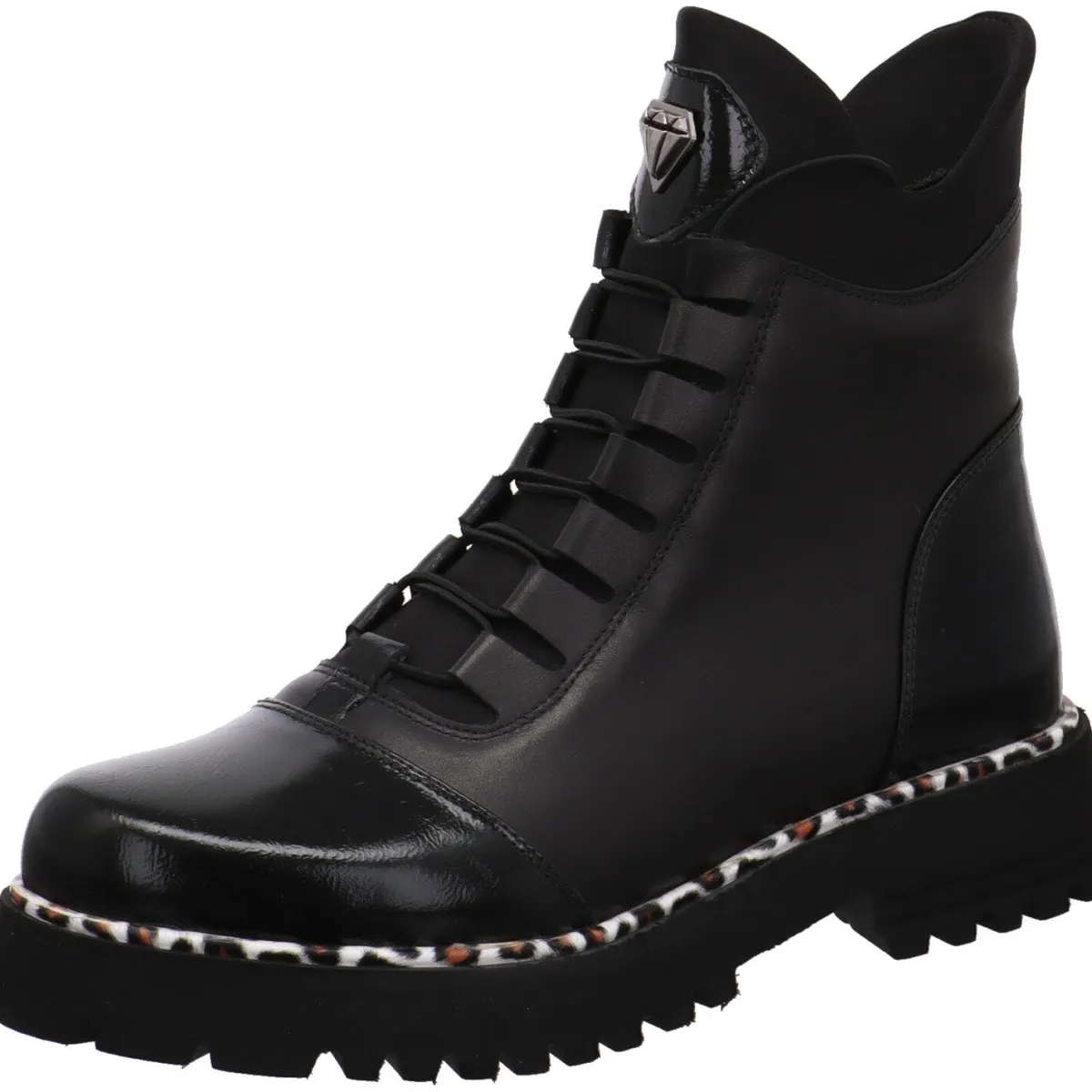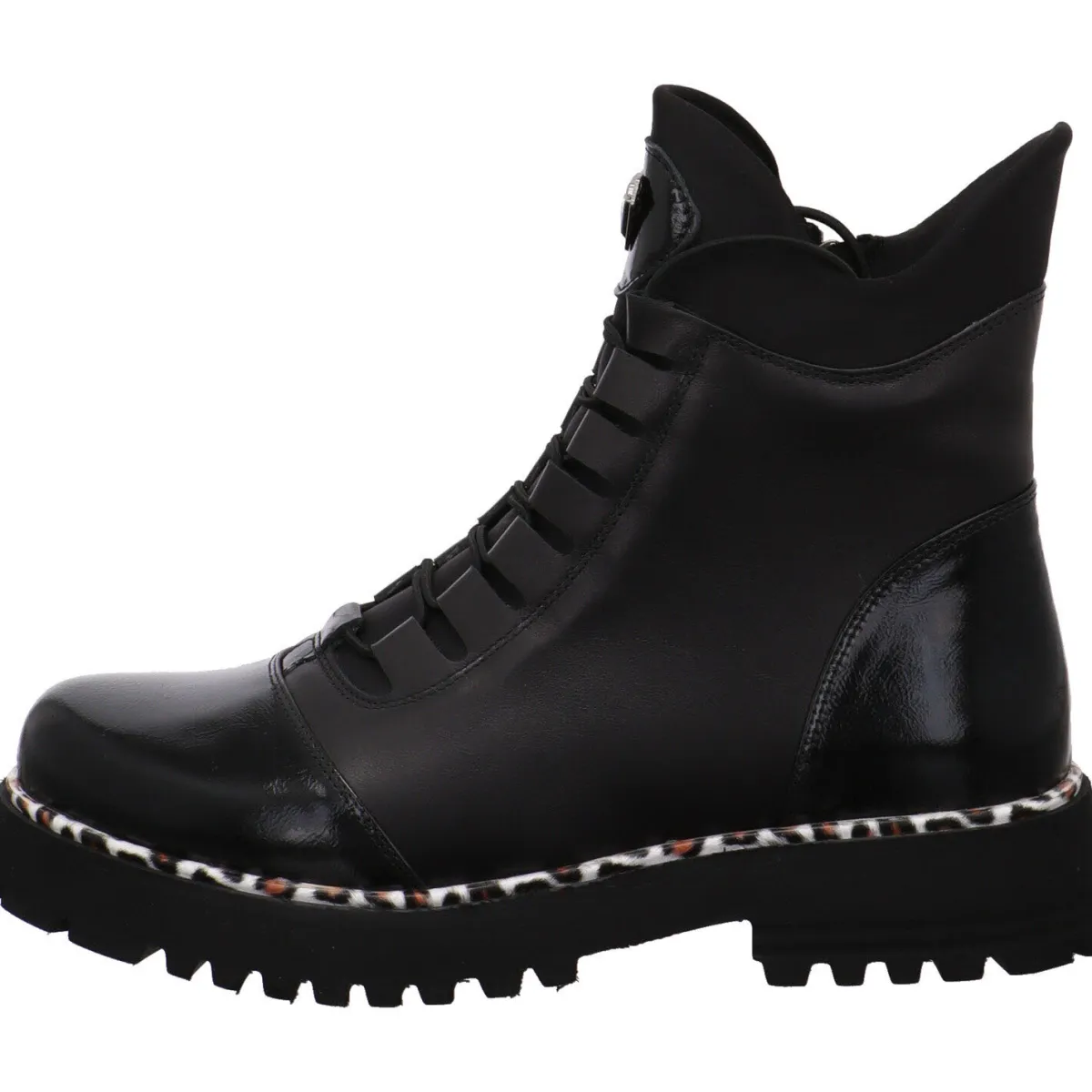 Er wurde aus hochwertigem Echtleder in Schwarz gearbeitet und ist am der Schuhspitze und Fersenkappe mit einem Lack Einsatz versehen. Der Schaft hat eine besondere Linienführung und ist mit einem Stretcheinsatz versehen. In Verbindung mit dem Reißverschluss ist der Ein- und Ausstieg ganz einfach. Durch die Gummischnürung kann er genau auf deine Bedürfnisse angepasst werden. Eyecatcher ist hier die Umrandung der Laufsohle mit einem Leo Animal Print.