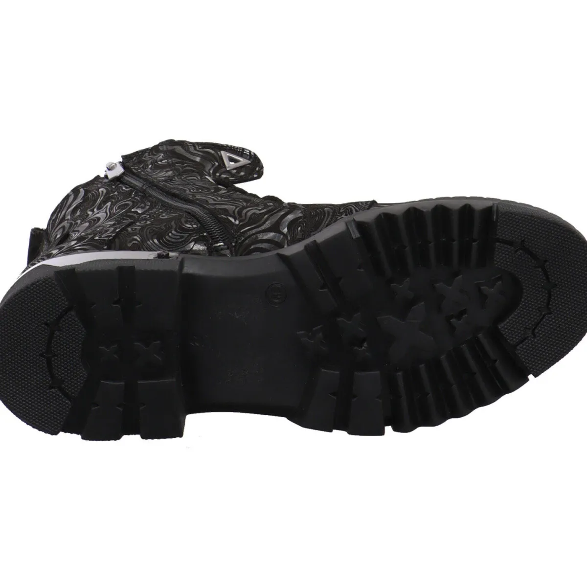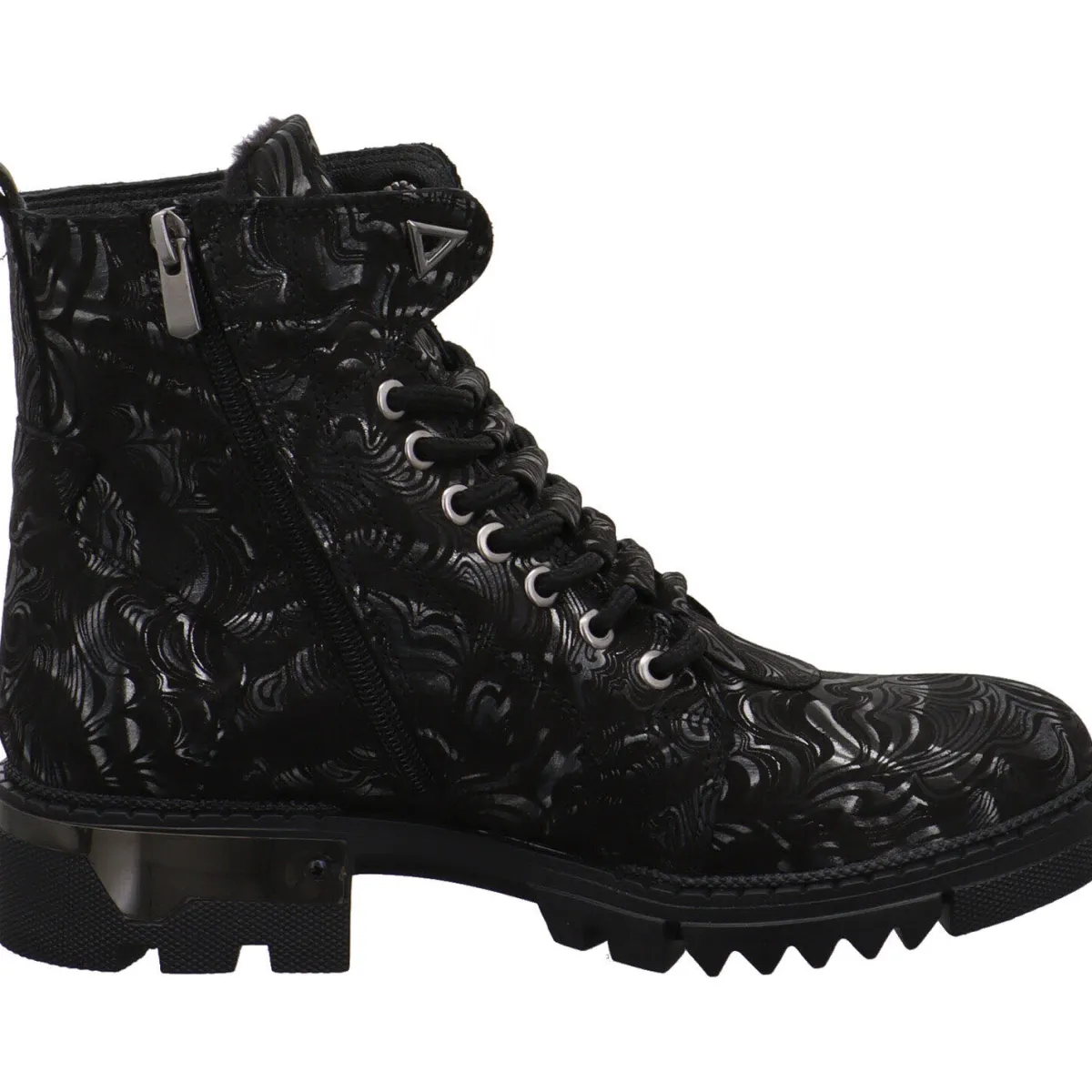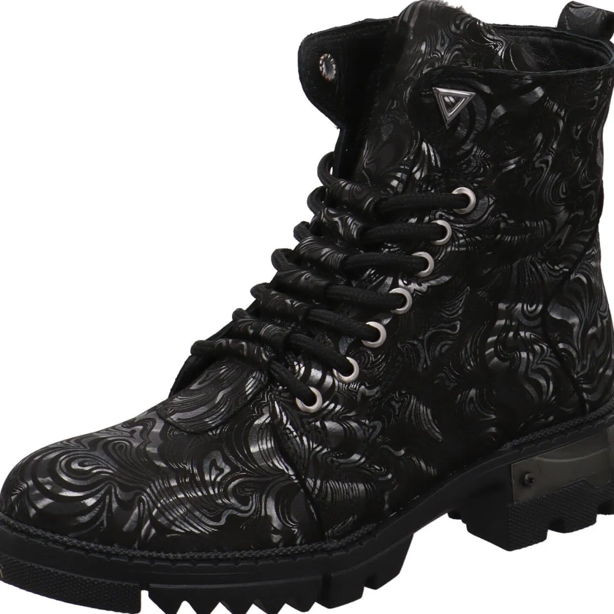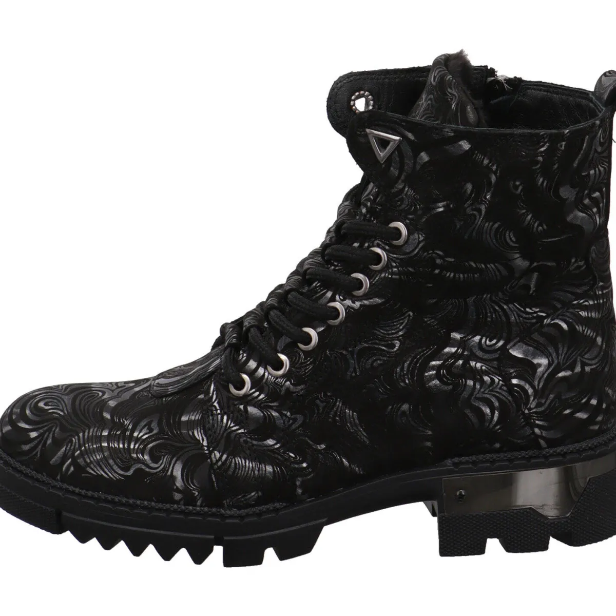 Das hochwertige Echtleder in Schwarz ist hier mit einem individuellen Muster in Silber verziert. Die markante Schnürung und der Metalleinsatz am Blockabsatz sind weitere Hingucker.
