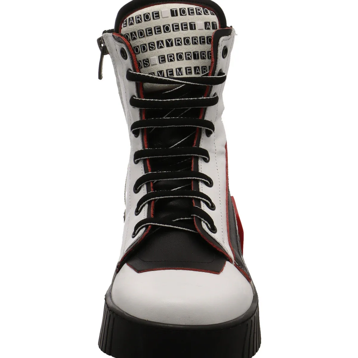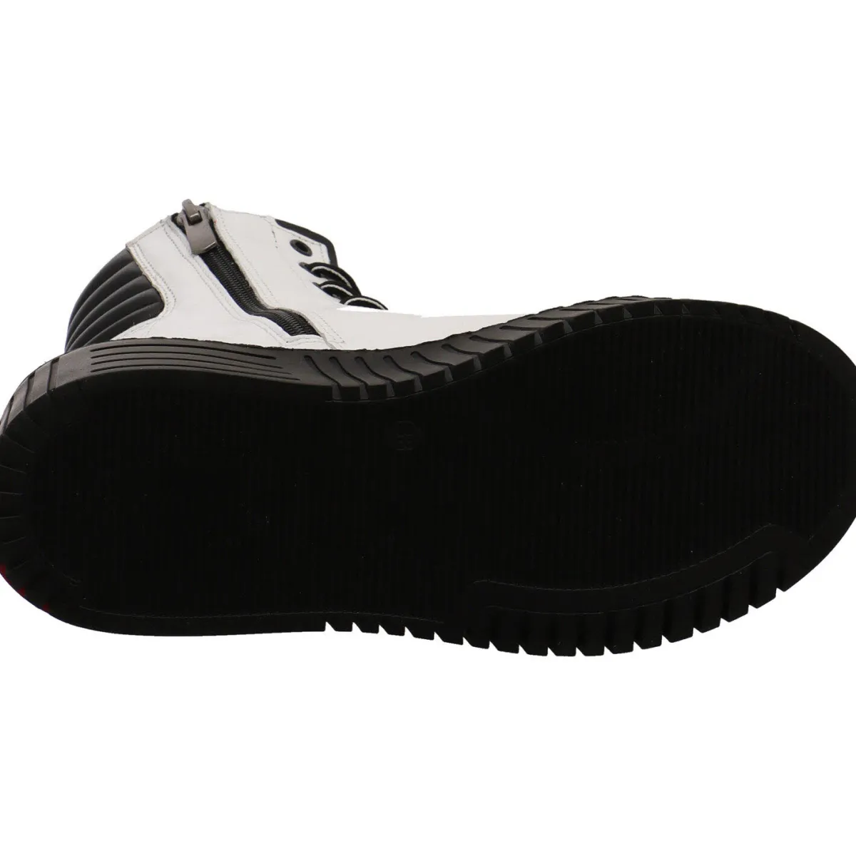 Das Obermaterial aus Glattleder in Weiß wird durch die Einsätze in Schwarz und den individuellen Print gekonnt in Szene gesetzt. Durch den seitlichen Reißverschluss und die Schnürung, ist ein leichter Einstieg möglich.