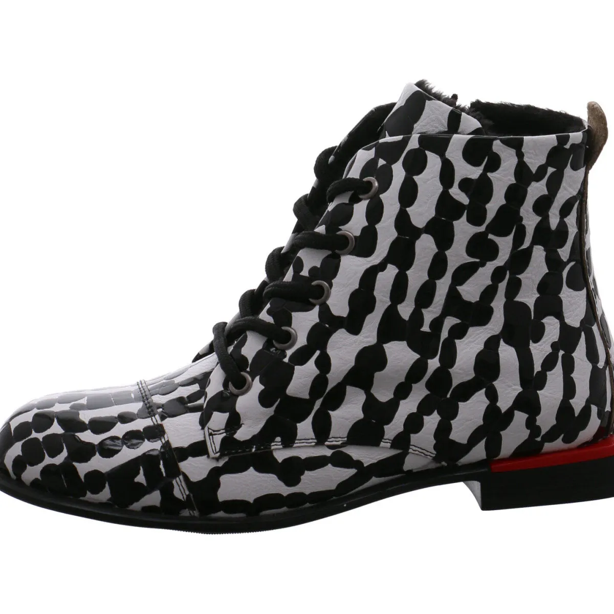 Gefertigt aus Echtleder in Weiß und Schwarz überzeugt sie mit Ihrem auffälligen Look. Ein besonderes optisches Highlight ist auch der Streifen in Rot am Absatz.