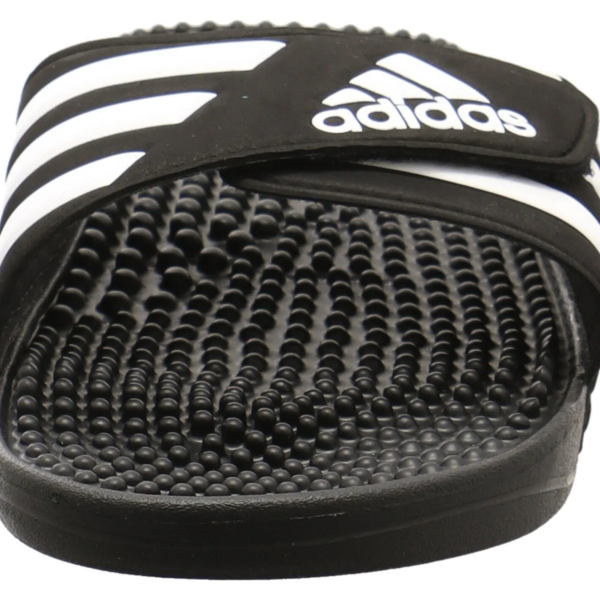 Das synthetische Obermaterial in Schwarz trocknet sehr schnell und durch den Klettverschluss lässt sich die Badepantolette optimal an den Fuß anpassen.