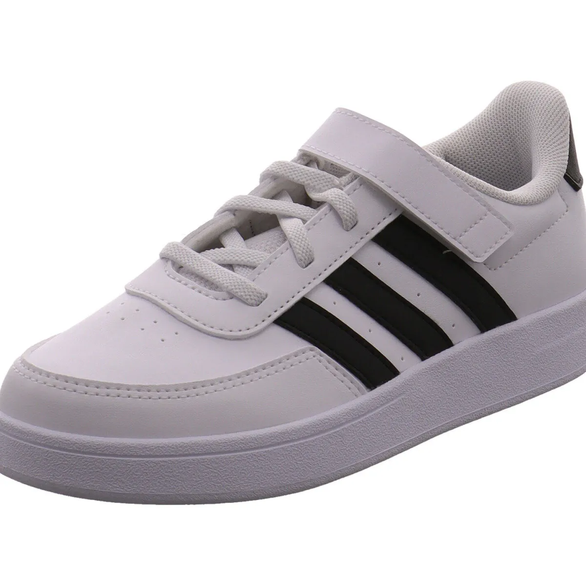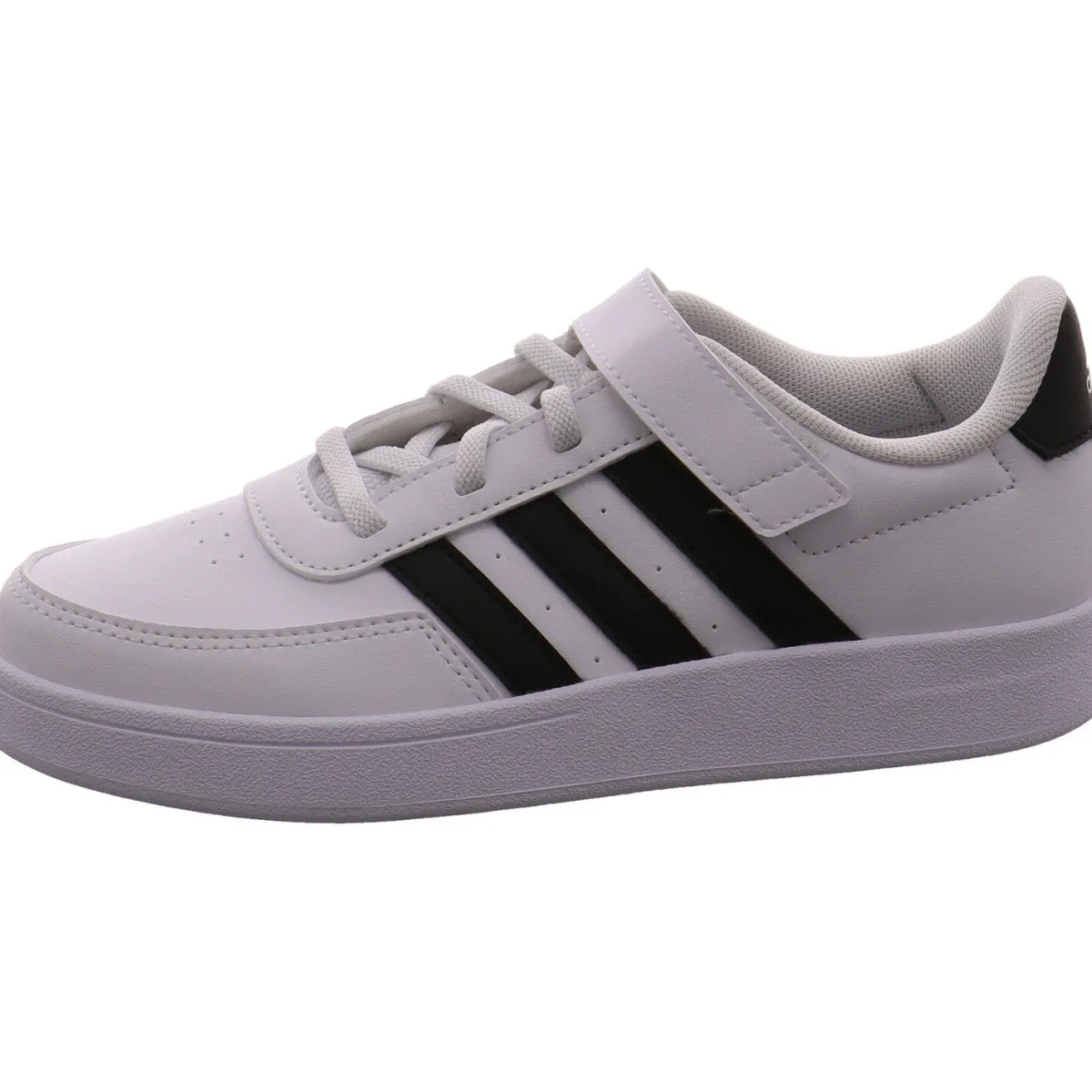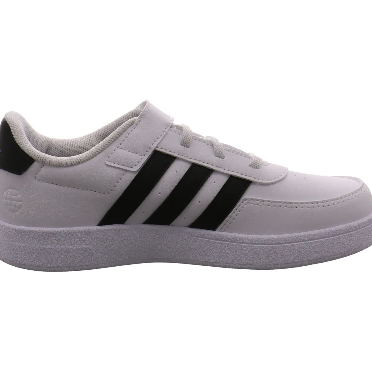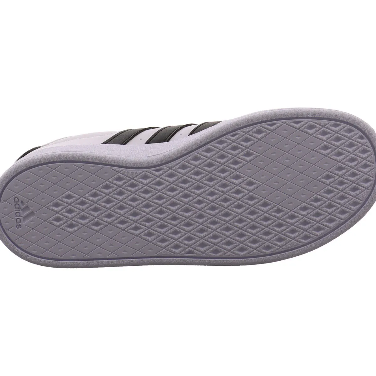 Das Obermaterial aus pflegeleichtem Kunstleder in klassischem Weiß lässt sich gut kombinieren und wird durch die seitlichen drei Streifen und die Fersenkappe in Schwarz optisch noch aufgewertet.