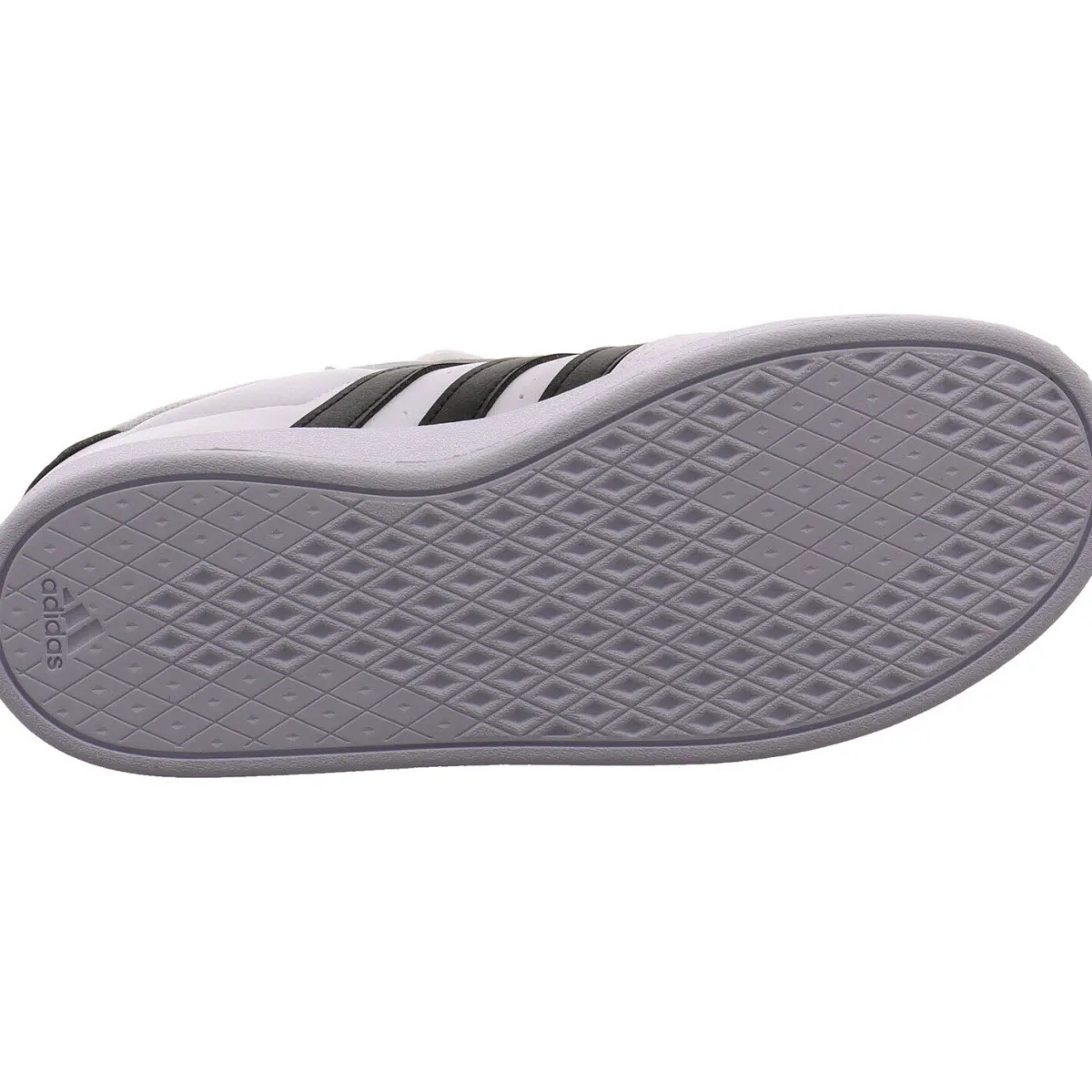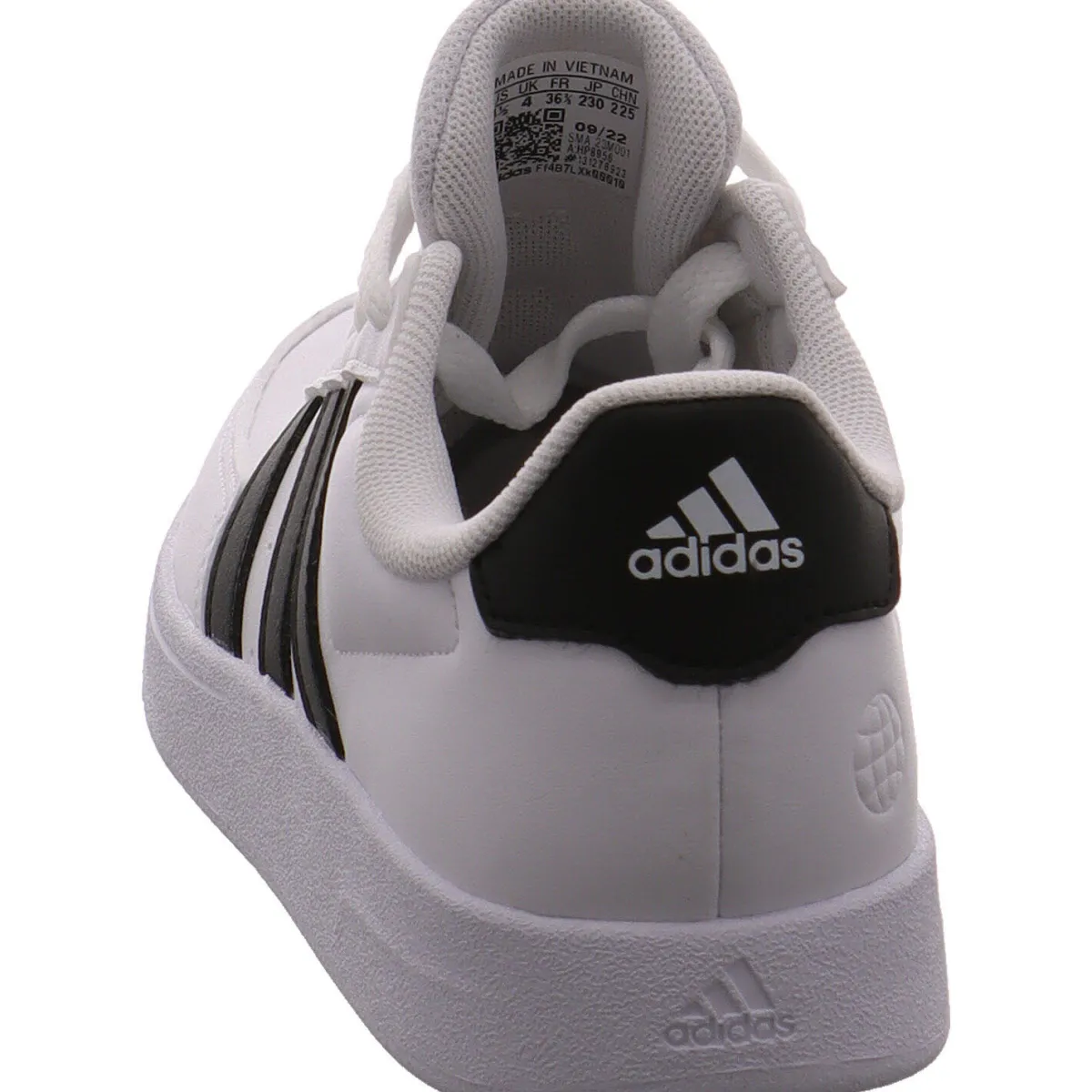 Das Obermaterial aus pflegeleichtem Kunstleder in klassischem Weiß, lässt sich gut kombinieren und wird durch die seitlichen drei Streifen und die Fersenkappe in Schwarz optisch noch aufgewertet.
