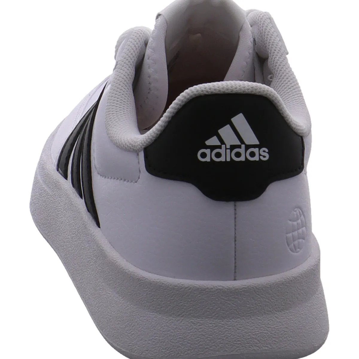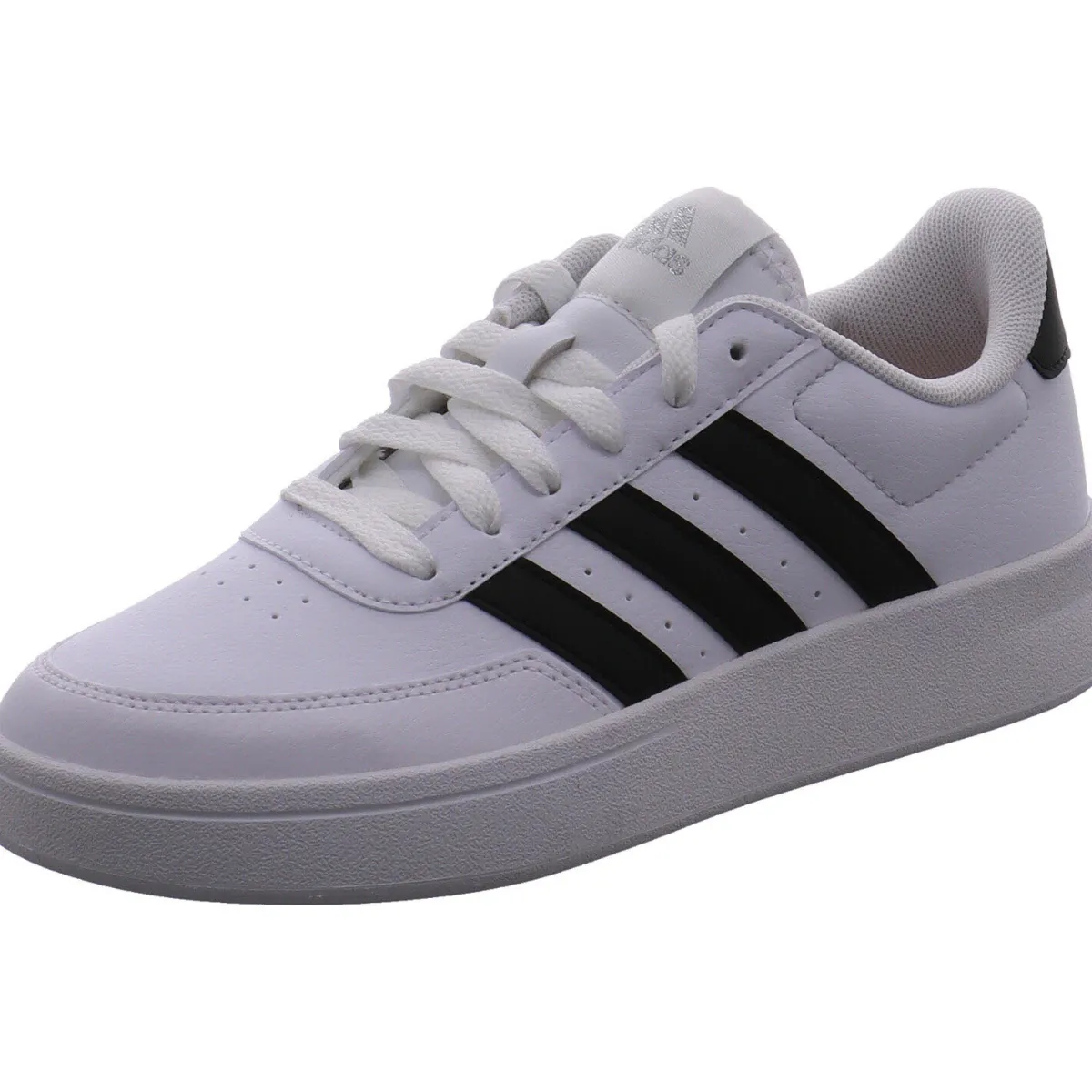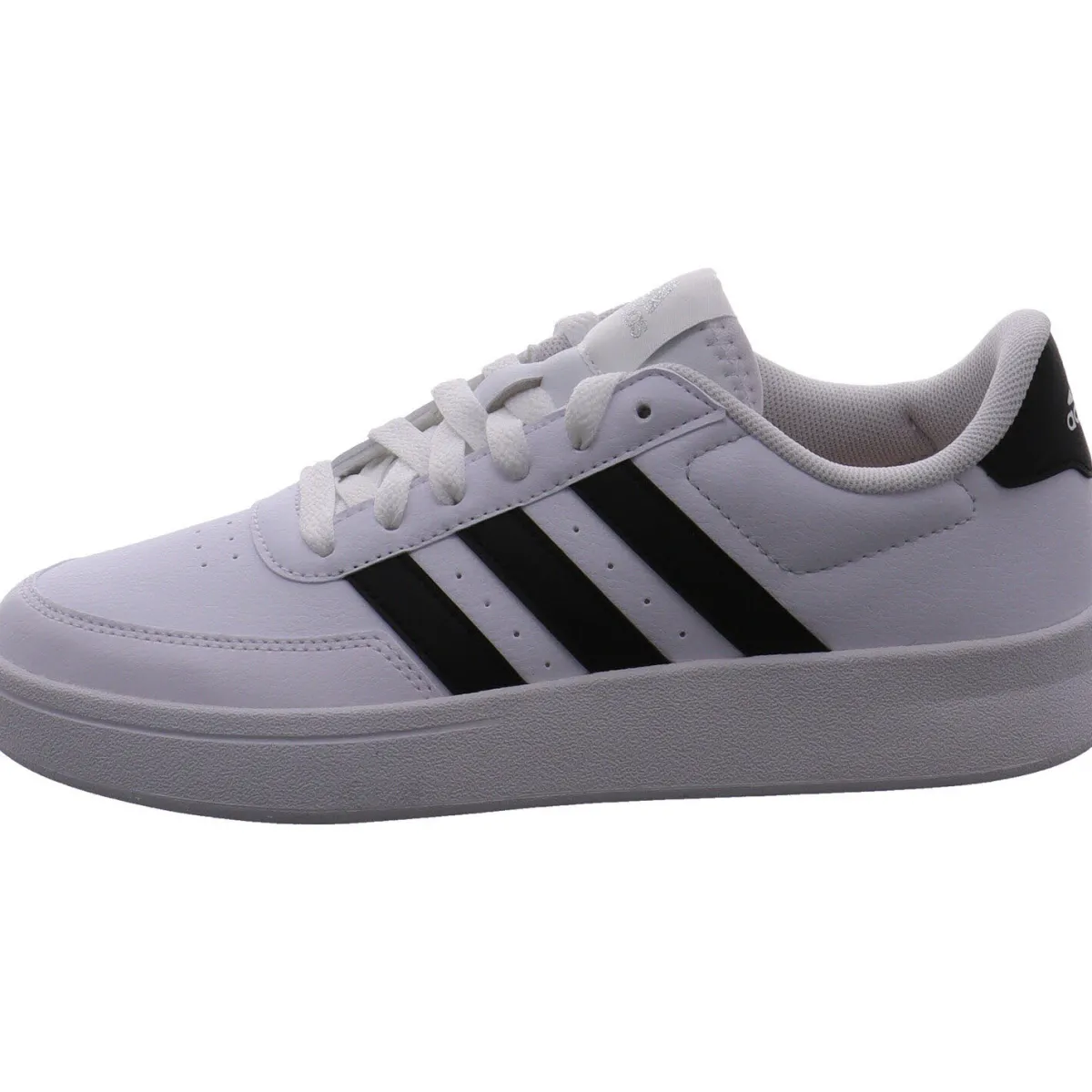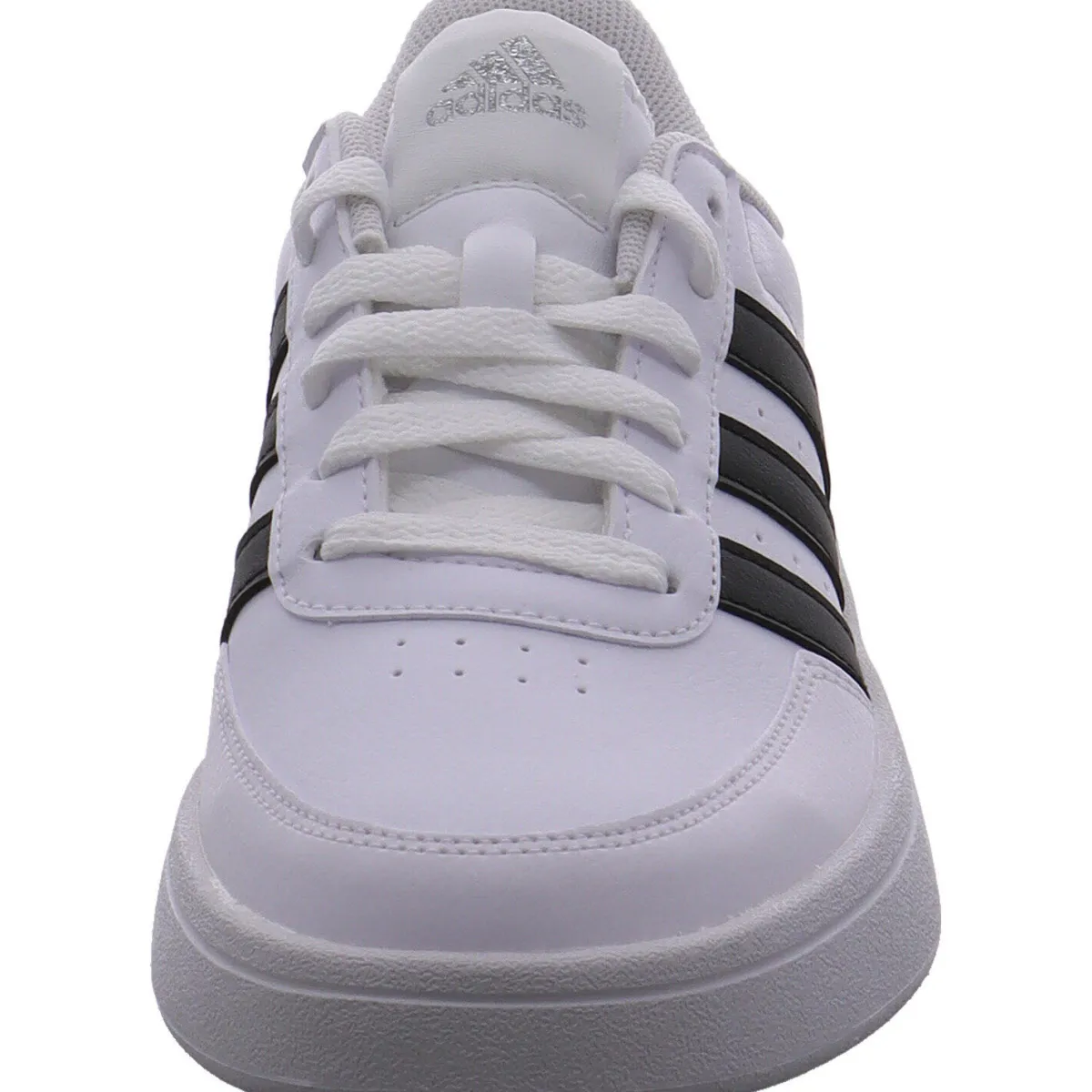 Das Obermaterial aus pflegeleichtem Kunstleder in klassischem Weiß, lässt sich gut kombinieren und wird durch die seitlichen drei Streifen und die Fersenkappe in Schwarz optisch noch aufgewertet.