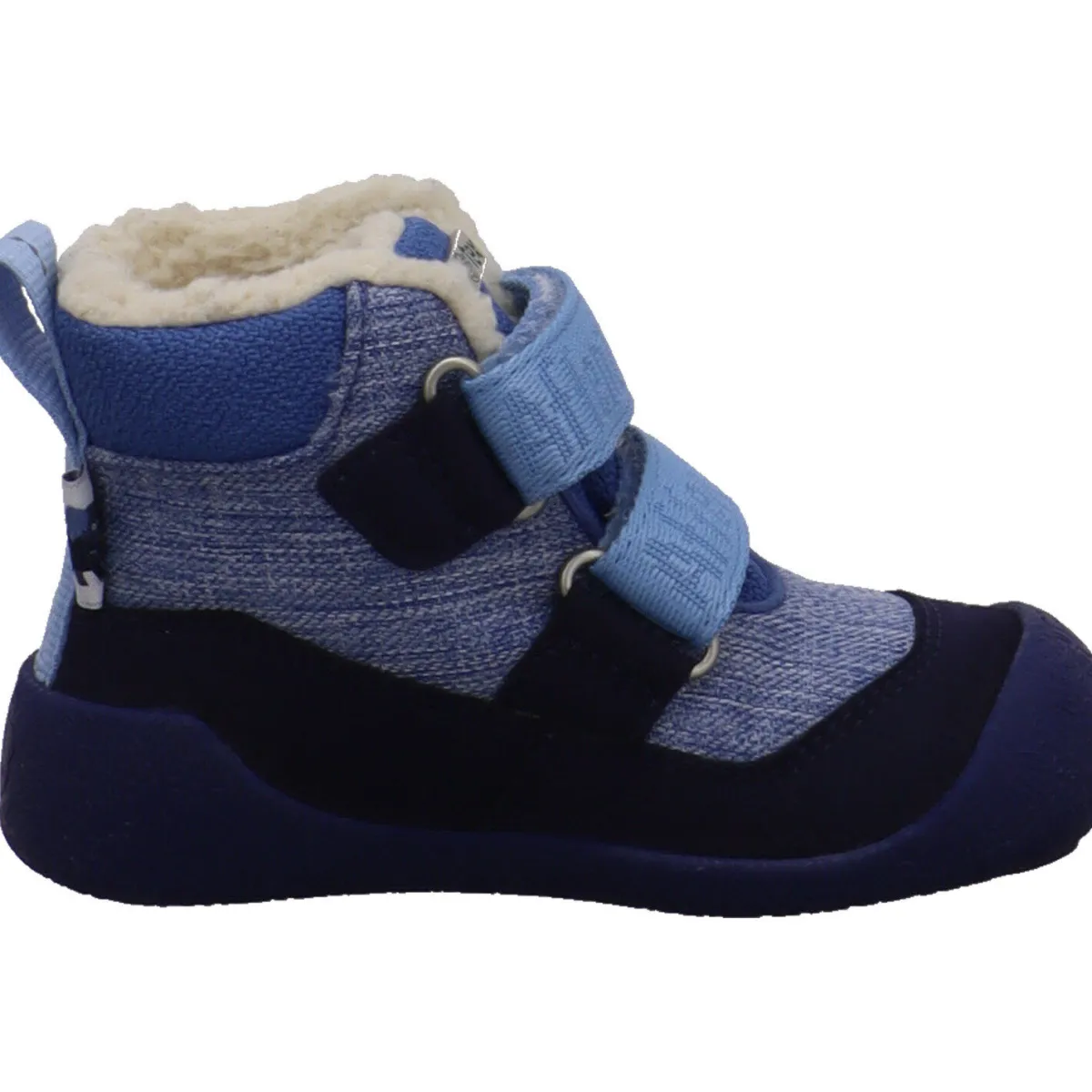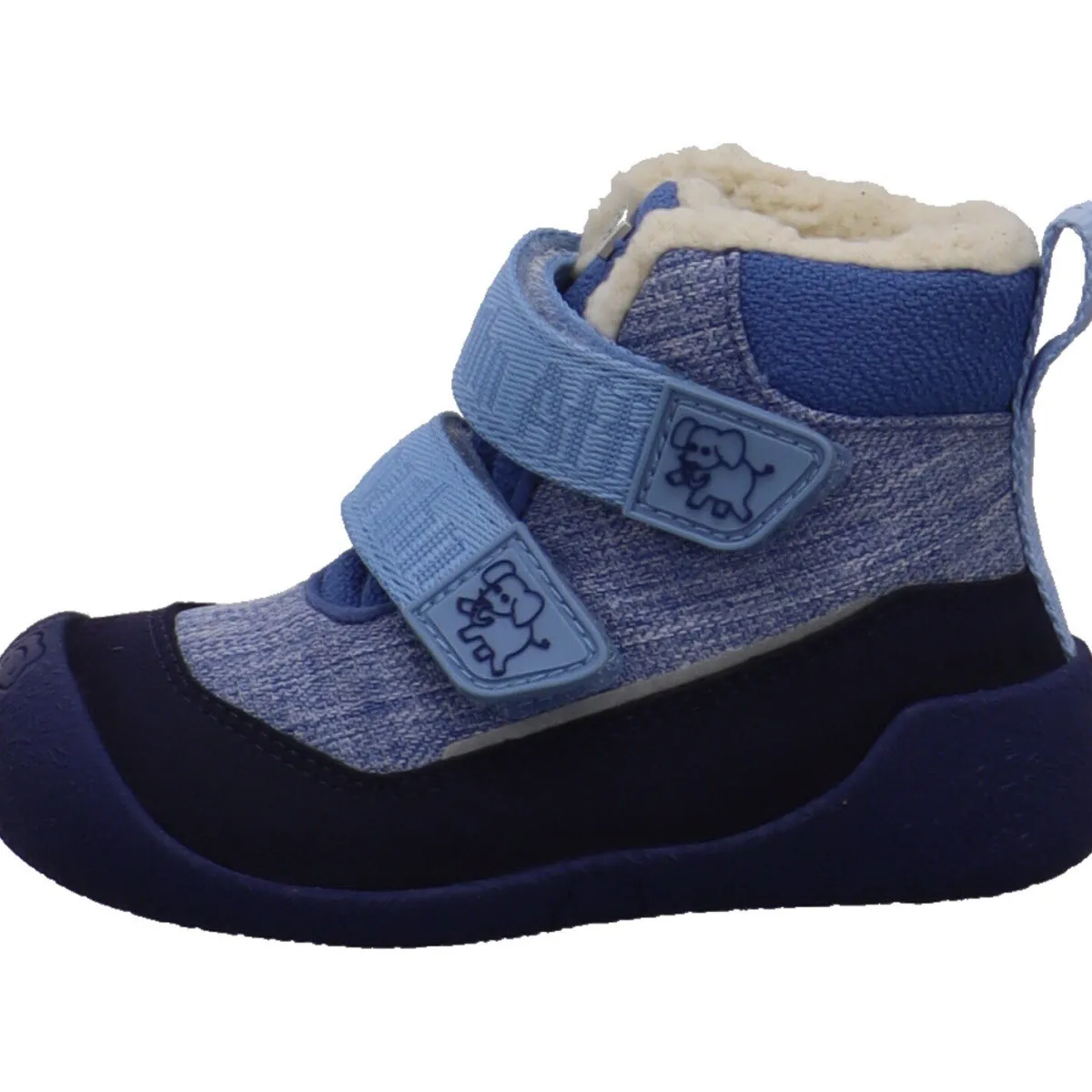 Er wurde aus recyceltem Polyester in Blau gefertigt. Durch den doppelten Klettverschluss auf dem der Elefant zu sehen ist, ist der Einstieg kinderleicht und der Stiefel kann genau an den Fuß angepasst werden.