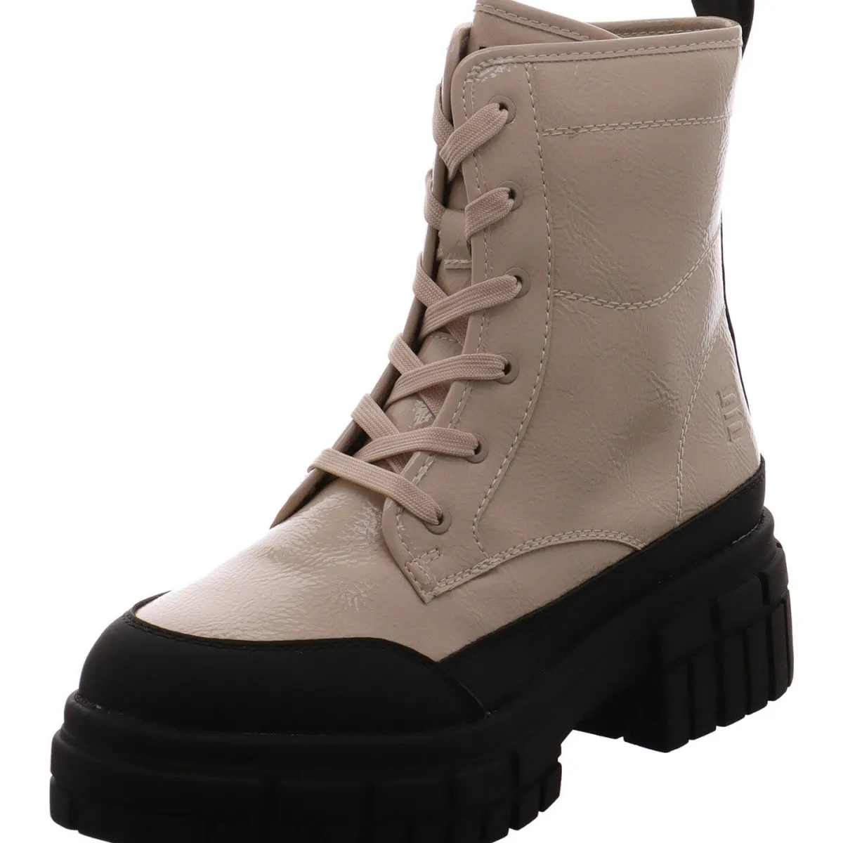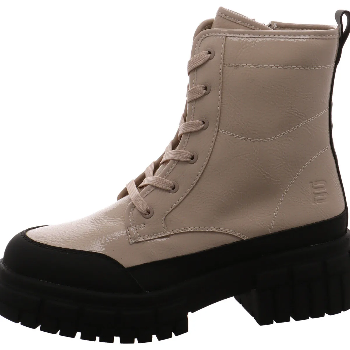 Gefertigt aus einem gekonnten Mix aus Kunstleder und Textil in Beige und Schwarz, wurde der Schuh mit einer Schnürung und einem Reißverschluss versehen, die für einen leichten Einstieg sorgen. Der Schuh ist komplett mit einer Umrandung in Schwarz versehen, die ihn besonders robust und stoßfest macht.
