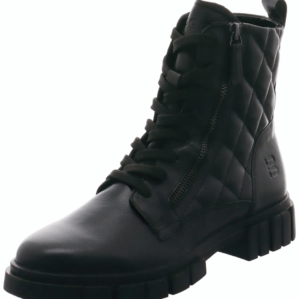 Das Obermaterial aus weichem Echtleder in Schwarz ist an der Seite vom Schaft mit einer besonderen Prägung versehen. Ein Zierzipper rundet das Design perfekt ab.