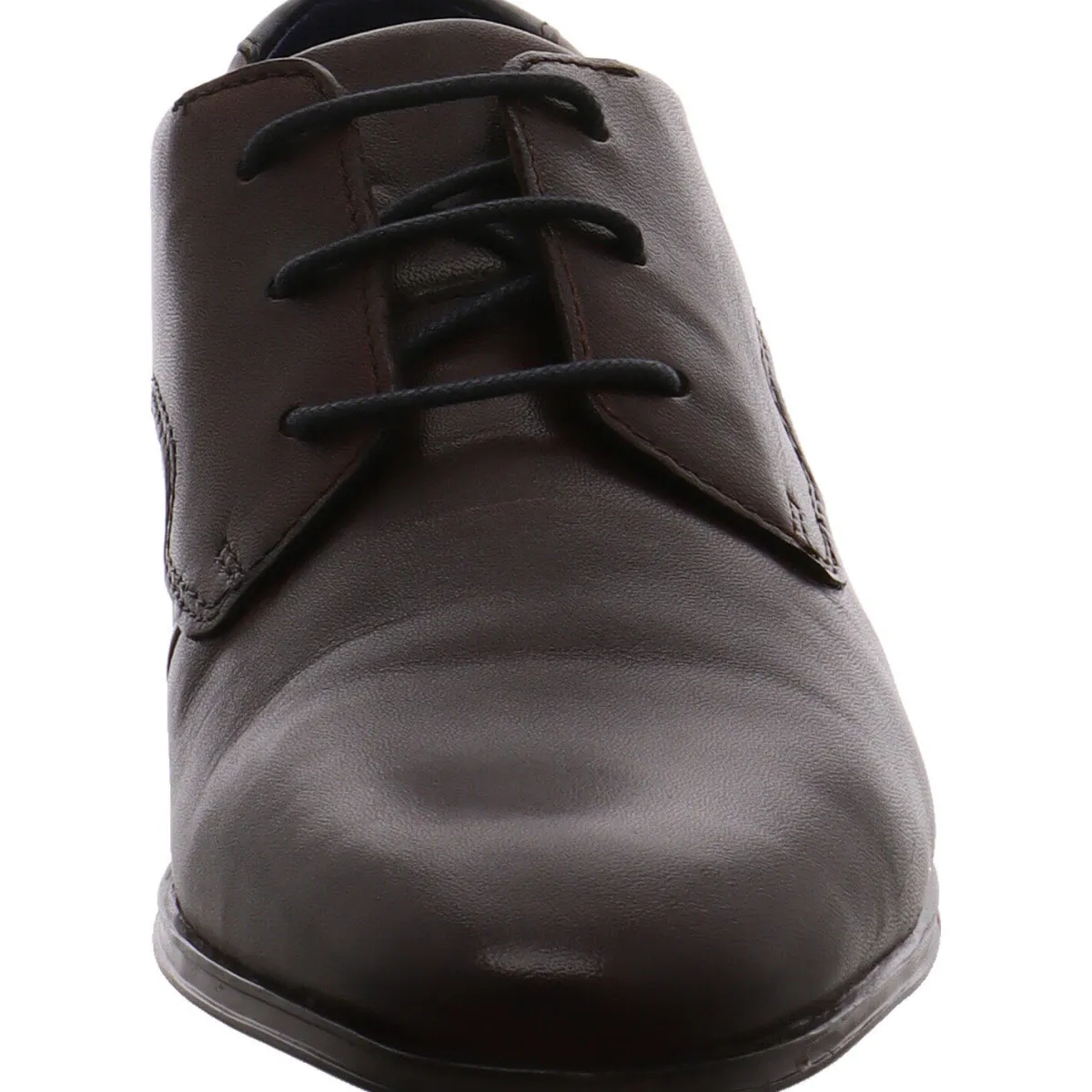 Das Obermaterial aus Glattleder in dunklem Braun ist an der Seite auf einer kleinen perforierten Oberfläche mit der Bugatti Aufschrift in Schwarz versehen. Dank der klassischen Drei-Loch Schnürung kann er optimal an den Fuß angepasst werden.