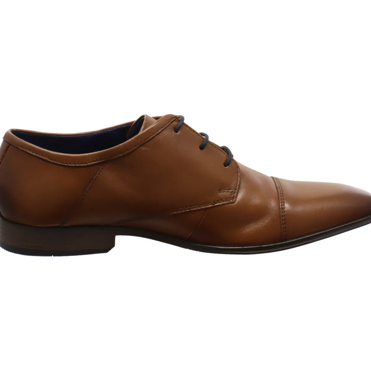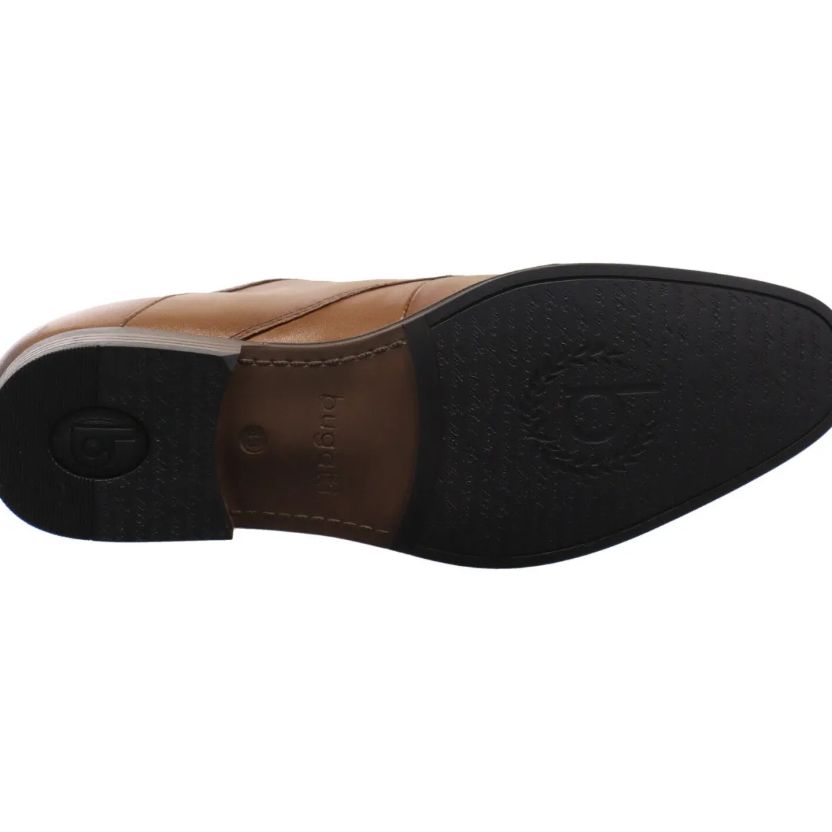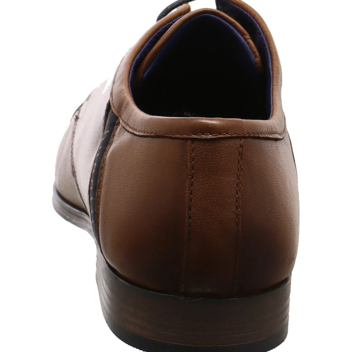 Das Obermaterial aus Glattleder in Cognac Braun ist an der Seite mit einem textilen Einsatz in Blau mit der Bugatti Markenaufschrift.