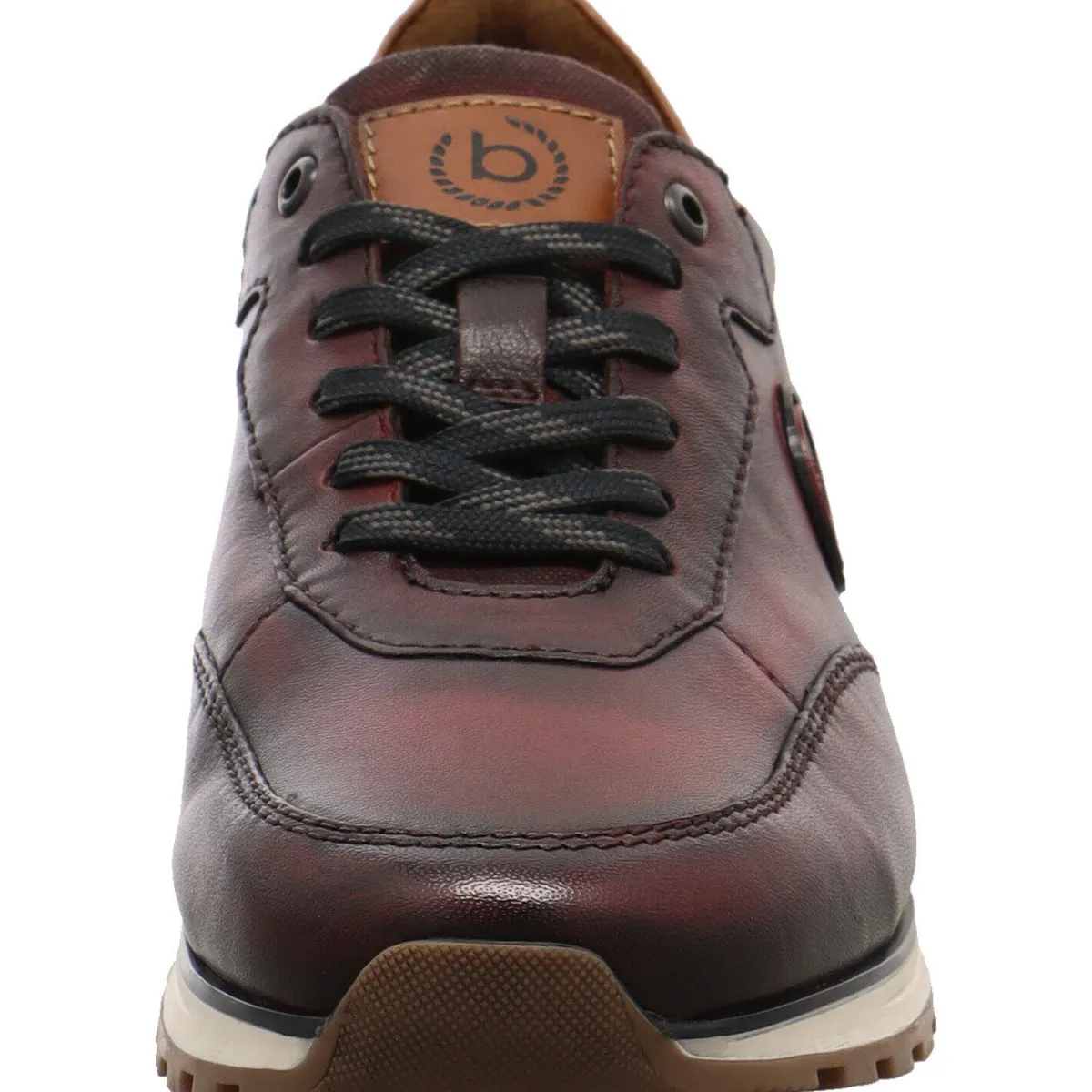 Gefertigt aus hochwertigem Echtleder in dunklem Rot macht der Schuh jede Bewegung individuell mit. Absolute Hingucker dieses Schuhs sind der seitliche Logo-Badge und die Overlayoptik. Einsätze an der Ferse aus Veloursleder in Blau und der Glattleder EInsatz am Schaft in Cognac Braun runden das Design des Schuhs gekonnt ab. Die regulierbare Schnürung ist in einem dunklen Blau abgesetzt und ermöglicht eine einfache Anpassung an den Fuß, während die profilierte Laufsohle für ausreichend Grip sorgt. Der Schaft ist angenehm gepolstert und die Innensohle als Wechselfußbett gearbeitet.