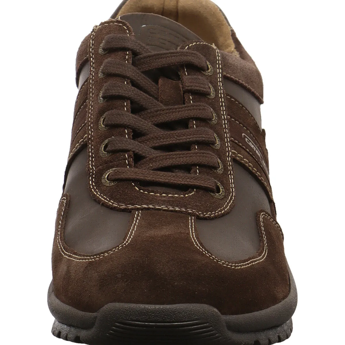 Gefertigt aus hochwertigem Veloursleder in Braun macht der Schuh jede Bewegung individuell mit. Absolute Hingucker dieses Schuhs ist die sportliche Overlayoptik. Die Glattleder Einsätze und die kleinen Details runden das Design gekonnt ab. Die regulierbare Schnürung ist ebenfalls in Braun gehalten und ermöglicht eine einfache Anpassung an den Fuß, während die profilierte Laufsohle für ausreichend Grip sorgt. Der Schaft ist angenehm gepolstert und die Innensohle als Wechselfußbett gearbeitet.