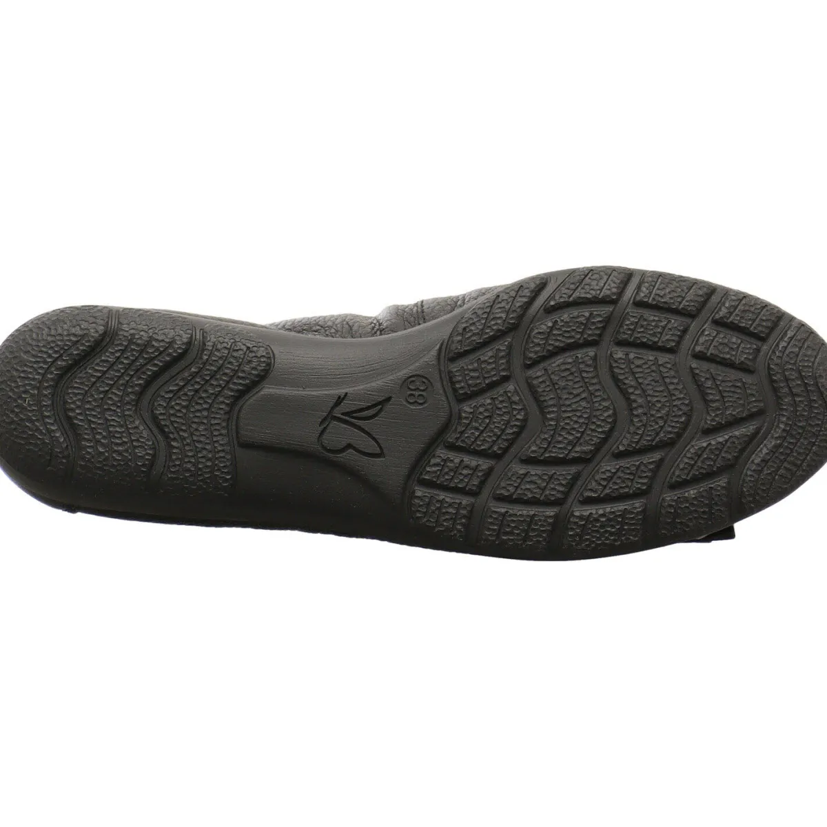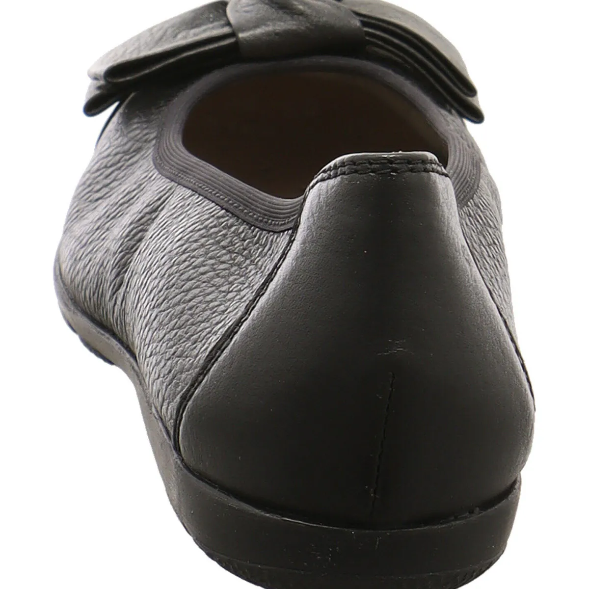 Er wurde aus hochwertigem, weichen Echtleder in Schwarz gearbeitet und hat eine authentische Narbung. Ein Hingucker ist die Schleife auf dem Blatt. Der Einstieg ist durch einen Stretch Einsatz besonders kormfortabel und die Echtleder Innensohle weich und perforiert. So hast du auch an warmen Sommer Tagen ein angenehmes Tragegefühl. Die Gummisohle ist rutschhemmend und der Schuh selbst sehr leicht und flexibel.