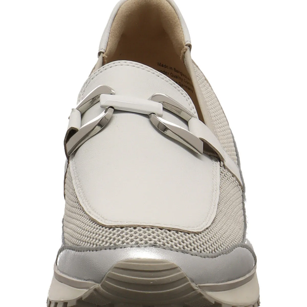 Gefertigt aus einem tollen Mix aus Echtleder und Textil in Weiß ist er seitlich als Netz gearbeitet und bietet dadurch eine tolle Luftzirkulation. Ein Hingucker ist die Metall Applikation über dem Rist. Die Rückseite vom Schaft ist angenehm gepolstert, höher gearbeitet und bietet einen tollen Tragekomfort.