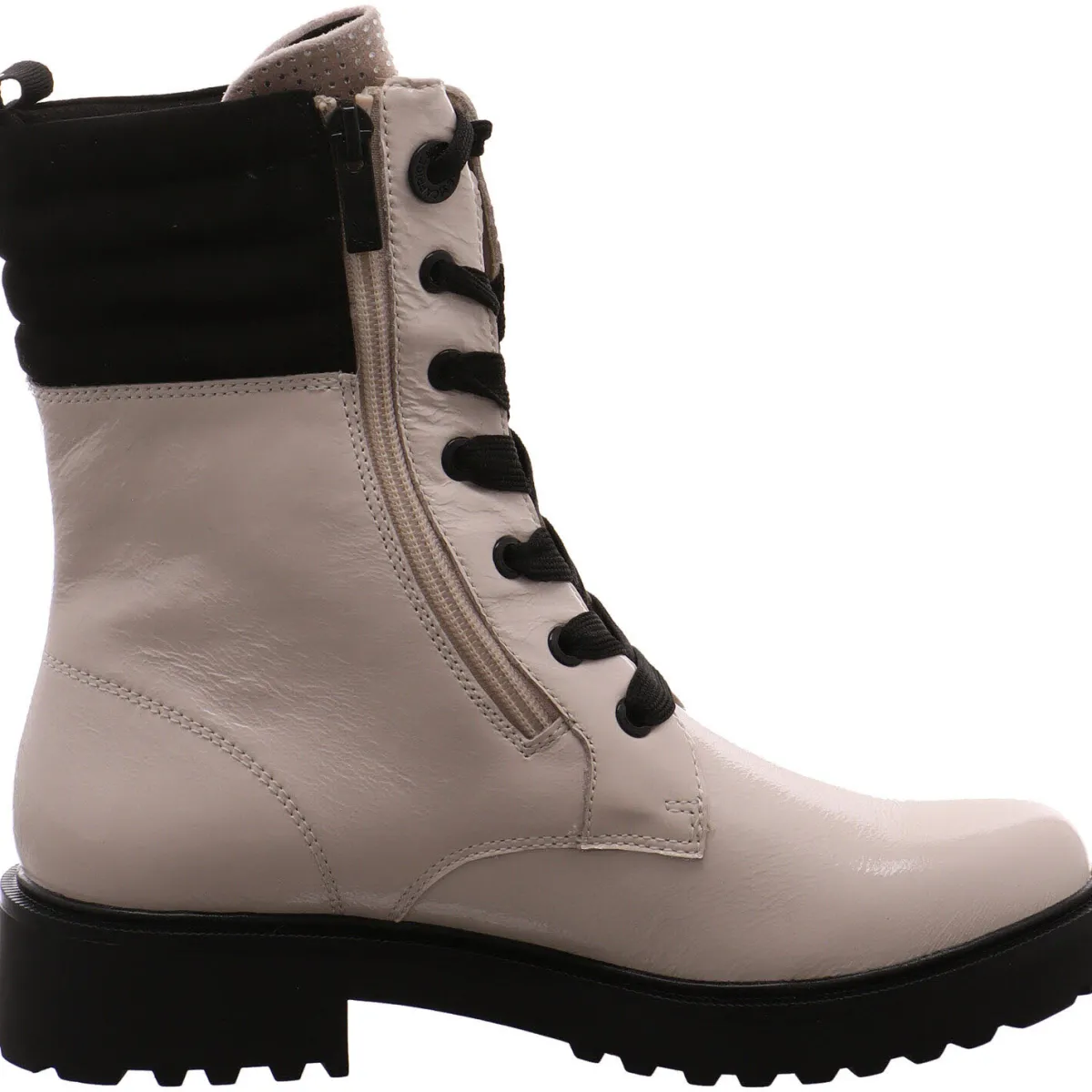 Das Modell aus dem Hause Caprice überzeugt mit einem hochwertigen Obermaterial aus Echtleder in glänzender Lackoptik in der Trendfarbe Beige, welches garantiert Blicke auf sich zieht. Der Schaftrand ist mit einem Textileinsatz in Schwarz abgesetzt und gepolstert.