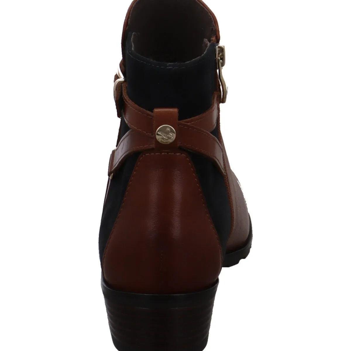 Gefertigt aus hochwertigem Glattleder in Cognac Braun, besticht das Design durch die Einsätze am Schaft aus Veloursleder in Blau. Zusätzliche Eyecatcher ist Riemen um den Schaft welcher mit einer Schnalle in Gold verziert ist. Die Schuhspitze ist zusätzlich mit einem goldenen Einsatz versehen und gibt dem Schuh das gewisse Etwas.