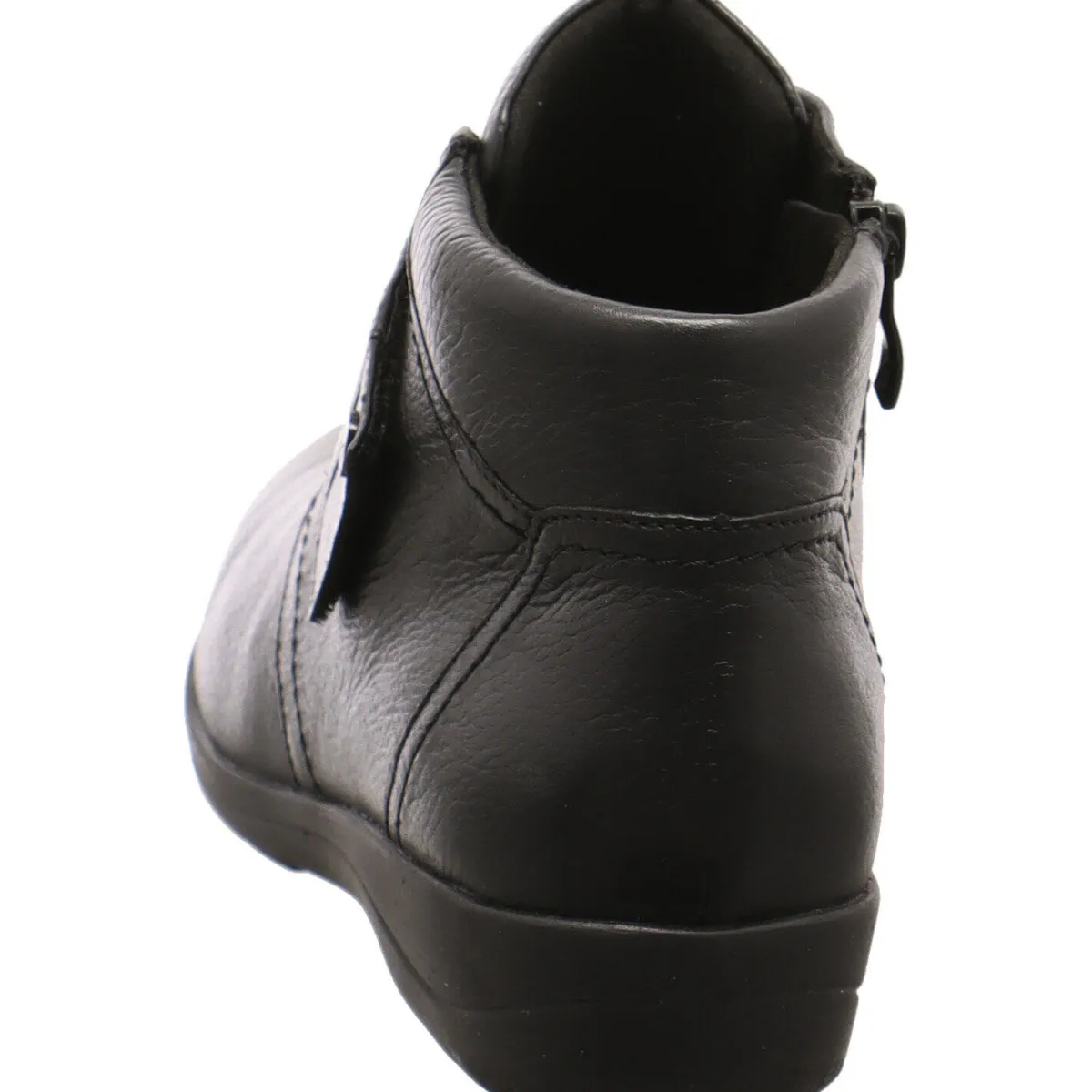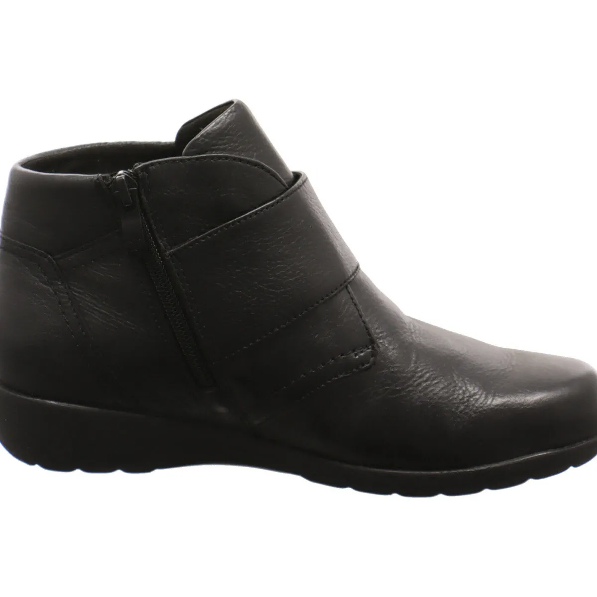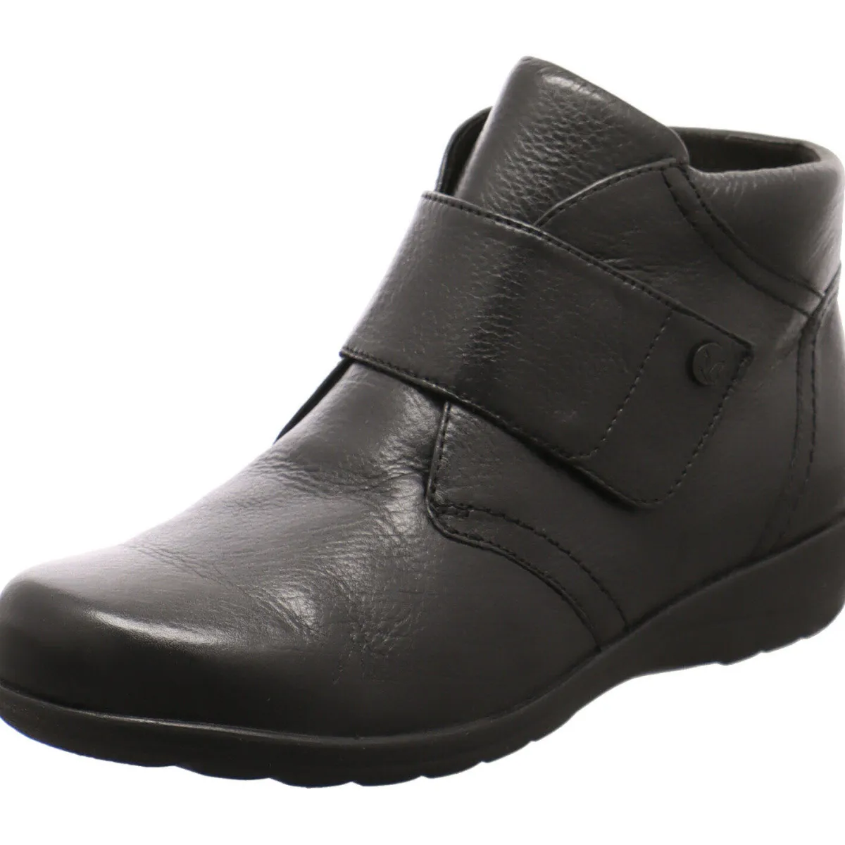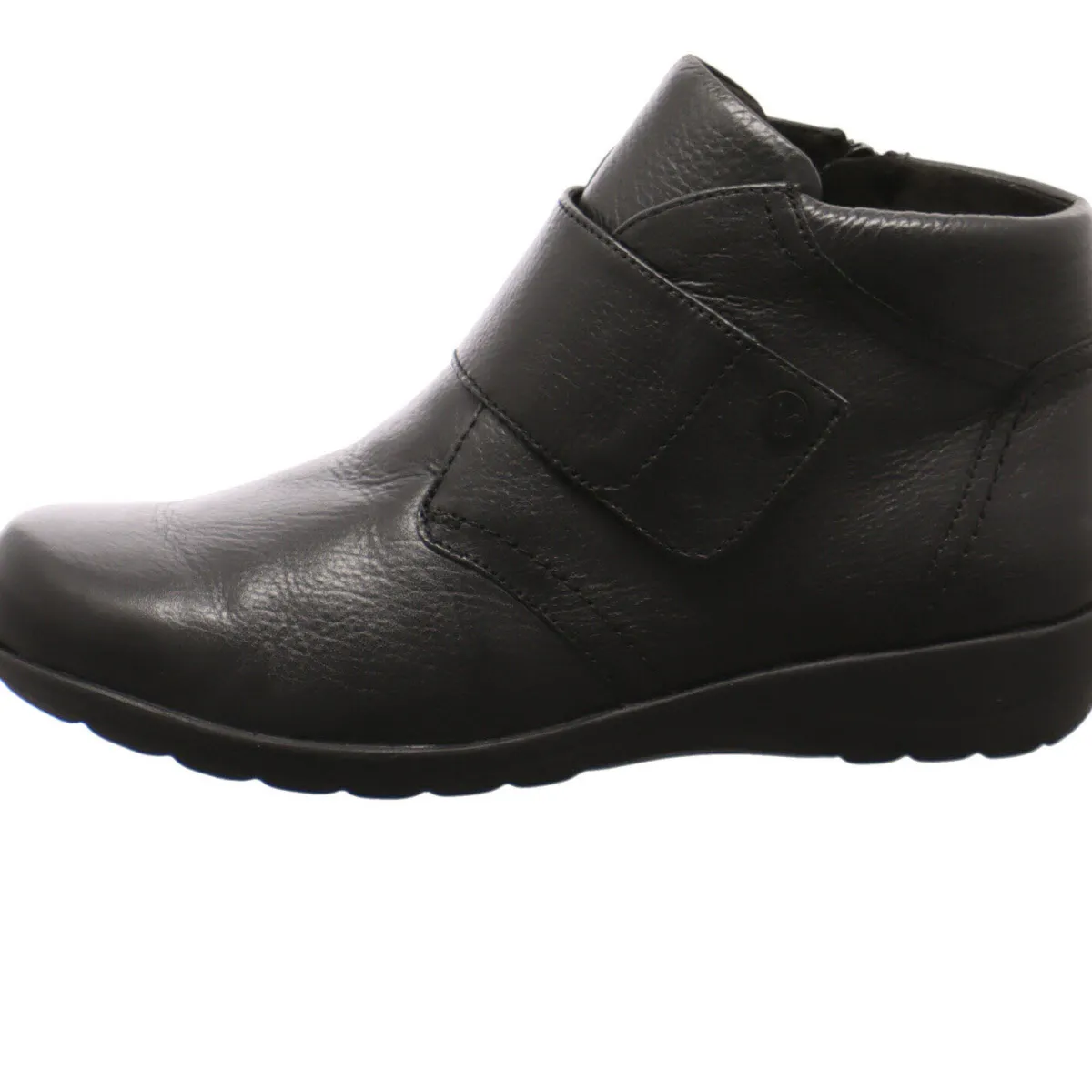 Durch den einfachen Klettverschluss auf dem Spann in Kombination mit dem seitlichen Reißverschluss ist ein leichter Ein- und Ausstieg gewährleistet. Die Stiefelette ist mit der Weite H ausgestattet, was für etwas mehr Platz sorgt und durch das Wechselfußbett lassen sich problemlos eigene Einlagen verwenden. Die kleine Applikation auf dem Klettverschluss mit dem Caprie Logo rundet das schlichte Design gekonnt ab.
