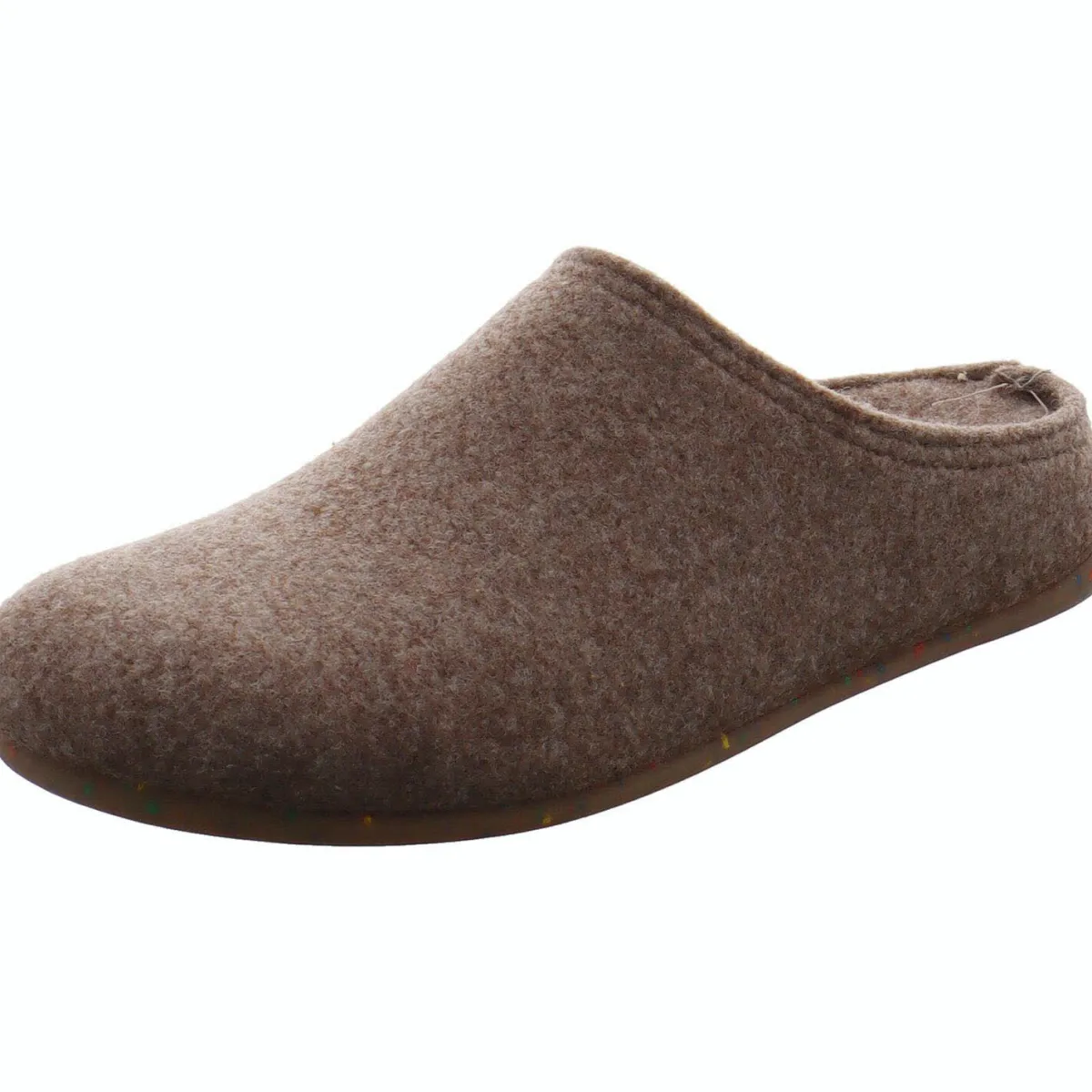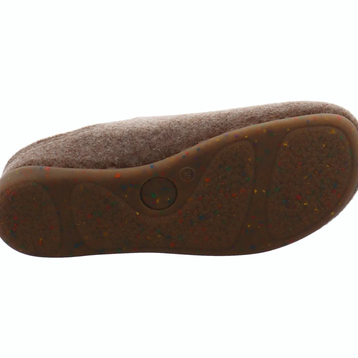 Das Obermaterial aus recycelten PET Flaschen, in Beige, hat die Haptik von Filz. Durch das Wechselfußbett eignet er sich auch wunderbar für lose Einlagen. Die Gummisohle begeistert durch ihre Bunten Einschlüsse und gibt perfekten Halt, so kommst du auch auf glatten Böden nicht ins Rutschen.