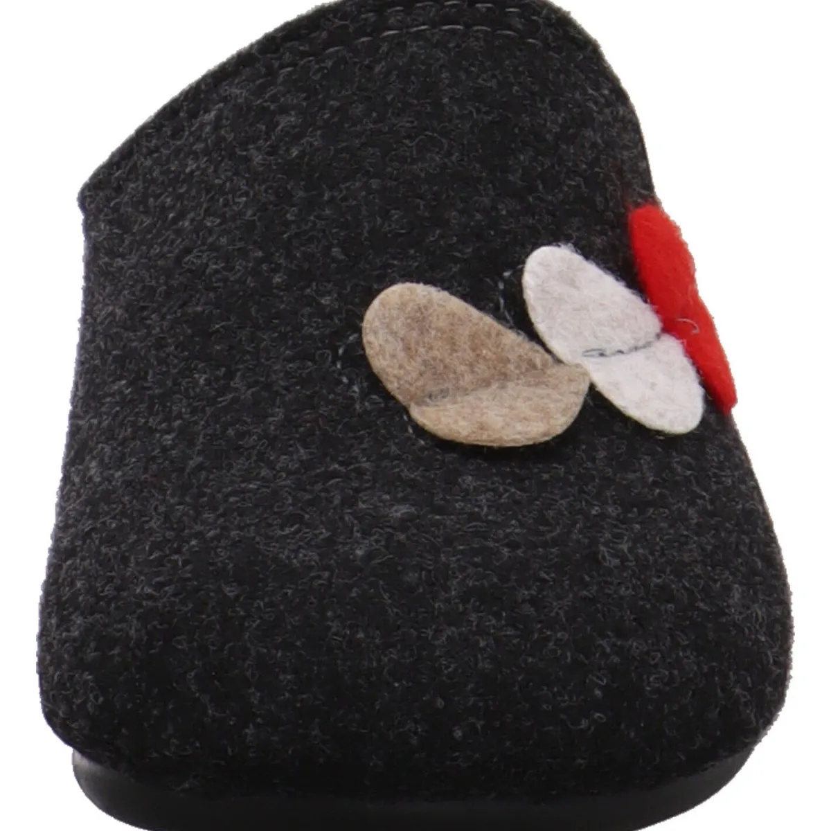 Er wurde aus Textil Filz in Anthrazit Grau gefertigt und ist auf dem Blatt mit einer Herz Applikation verziert.