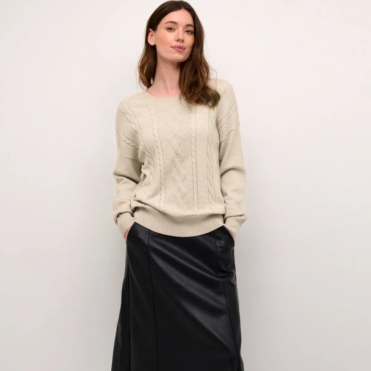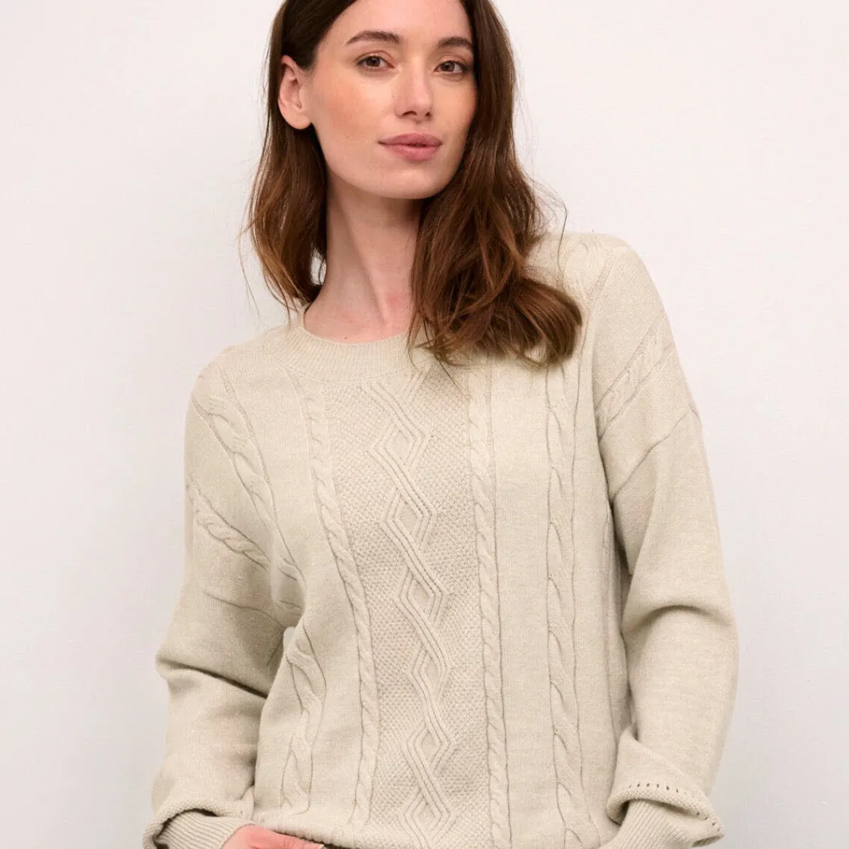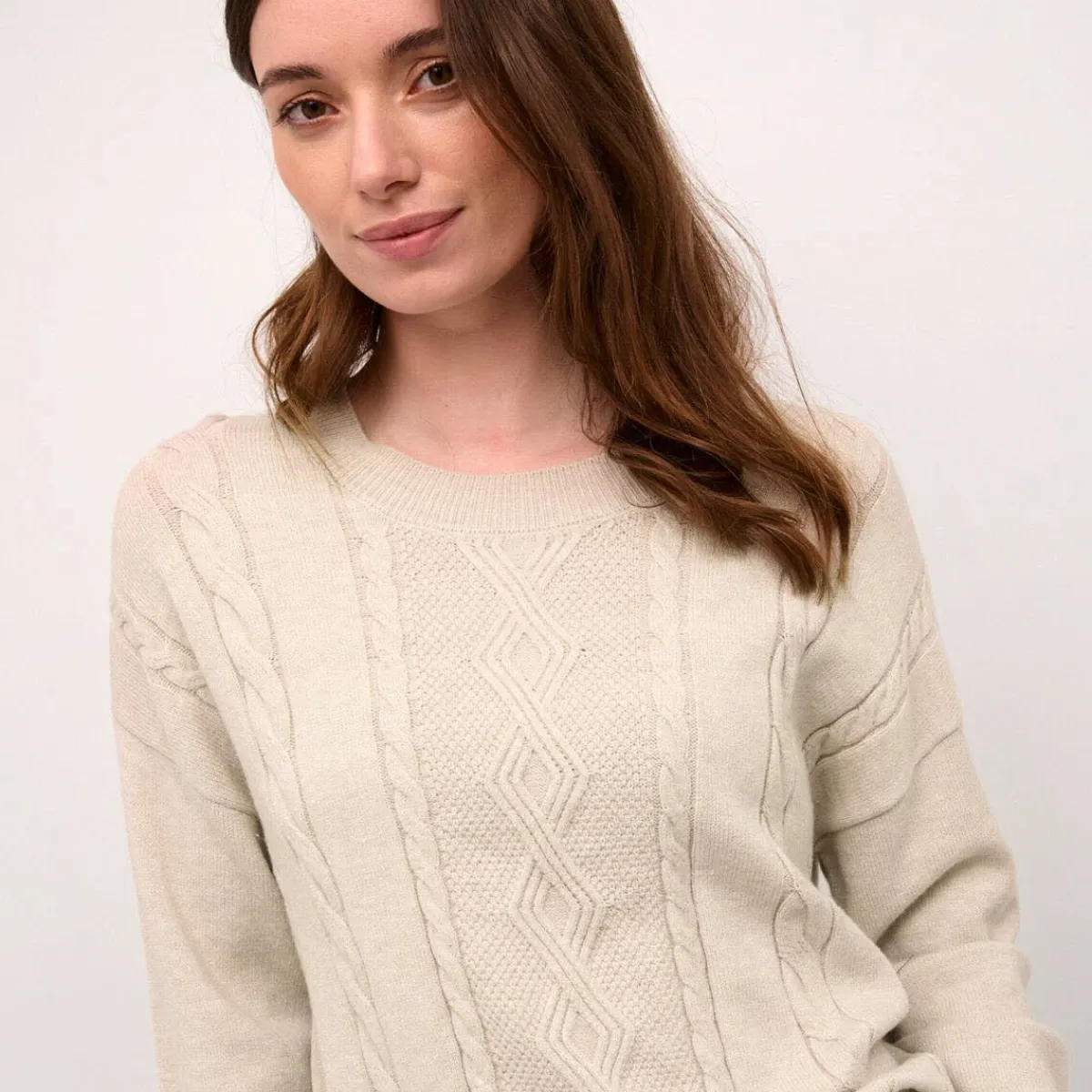 Das Strickgewebe in Beige ist mit einem schönen Zopfmuster verziert. Der Loose Fit Schnitt lässt sich angenehm tragen und passt perfekt zu Hose oder Rock.