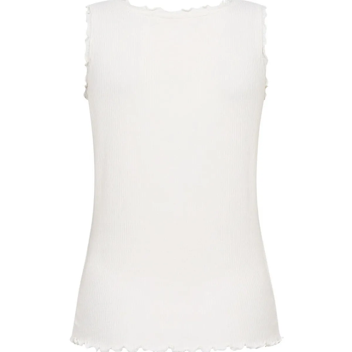 Es wurde aus einem angenehmen Mischgewebe in Weiß gefertigt und hat ein typisches Rippstrickmuster. Der Rundhalsausschnitt, die Ärmelausschnitte und der Bund sind mit einem Wellensaum gearbeitet und machen es zu einem Blickfang.