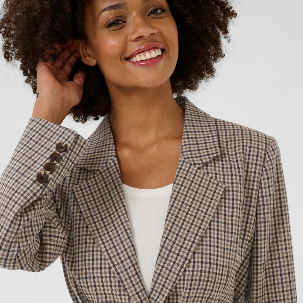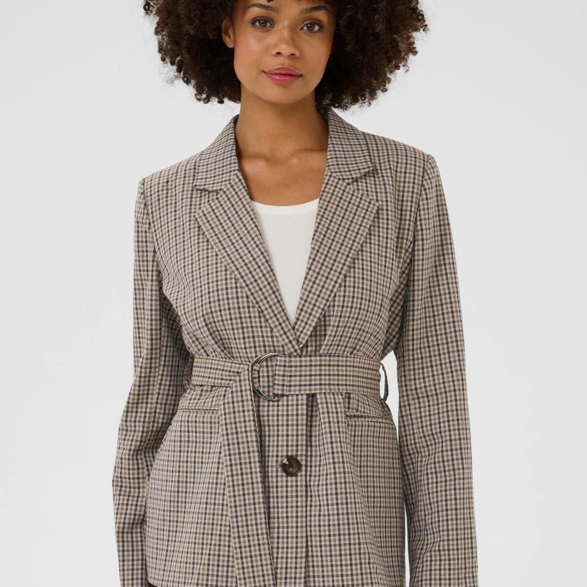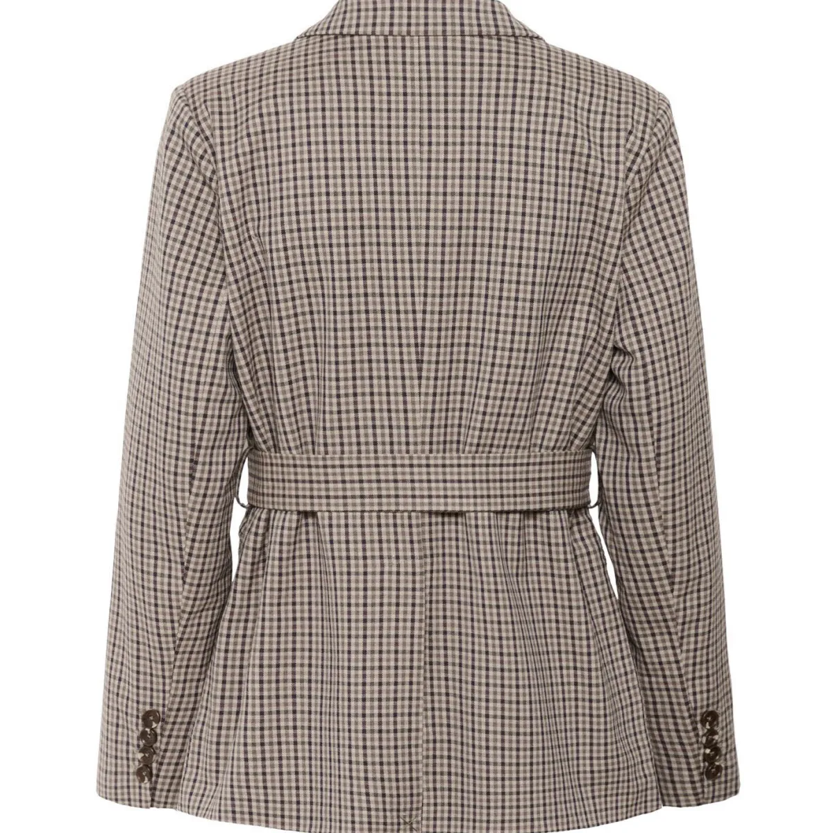 Er ist mit einem angesagten Karo Muster in Braun versehen, hat einen klassischen Reverskragen und wird mit zwei Knöpfen geschlossen. Als modisches Highlight hat er um die Taille einen breiten Binde Gürtel mit Stopperverschluss.