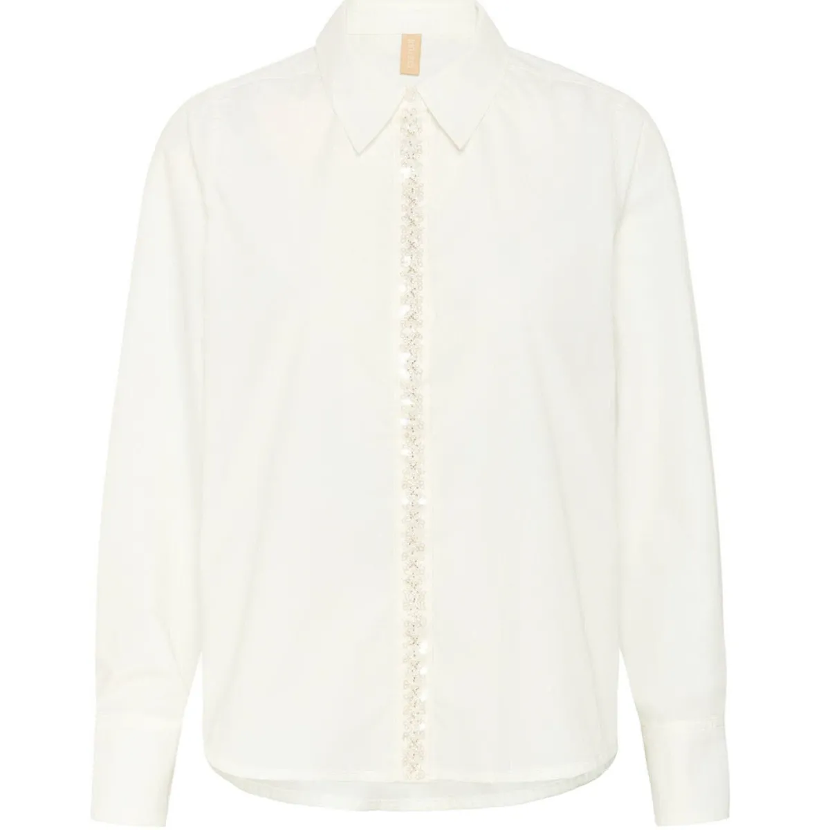 Das Mischgewebe mit Baumwolle in Creme Weiß ist durch den Oversize Schnitt besonders bequem. Die Bluse hat einen klassischen Kragen und lange Ärmel. Die Knopfleiste auf der Vorderseite ist durch eine Leiste verdeckt, diese ist mit kleinen Perlen und Pailletten verziert und machen sie zu einem Eyecatcher.