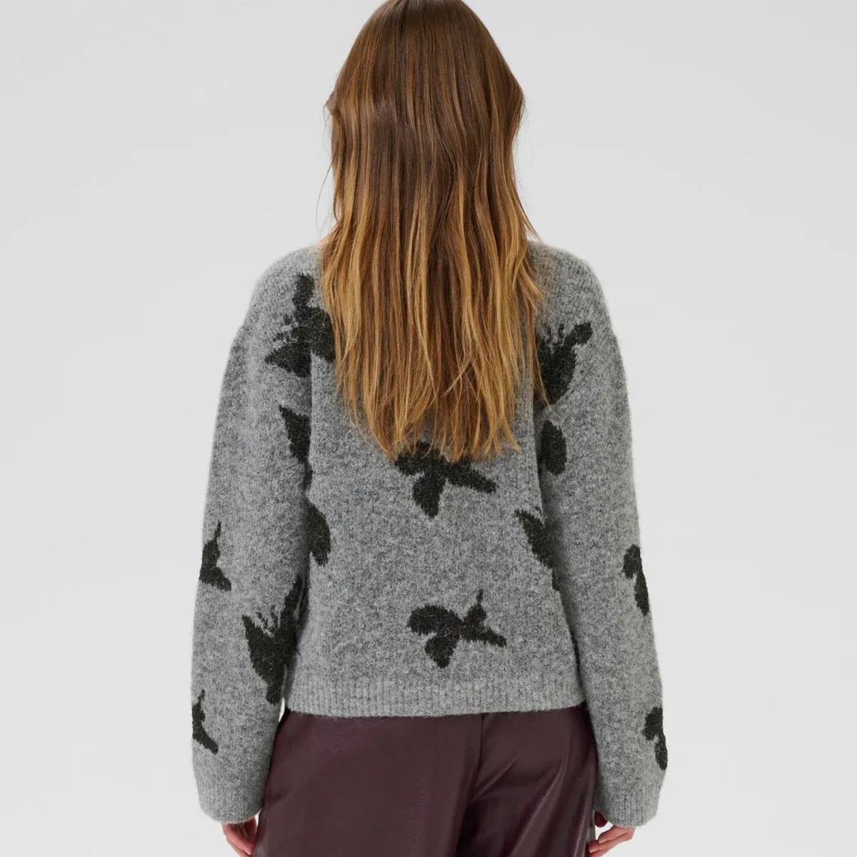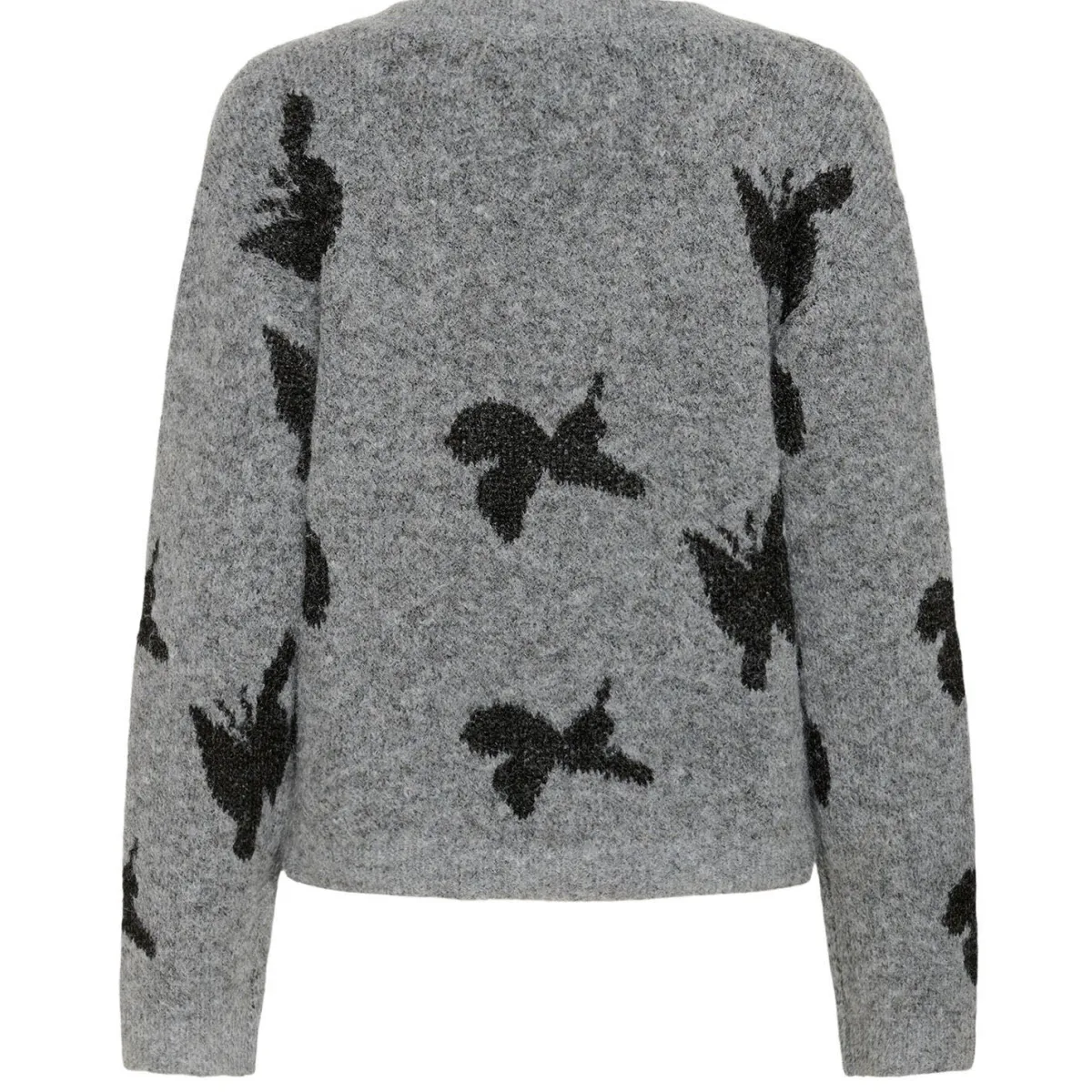Das Strickgewebe in Grau ist flauschig gearbeitet und mit einem Schleifen Print in Schwarz verziert. Der Pullover hat einen V-Ausschnitt, lange Ärmel und eine lockere Passform.