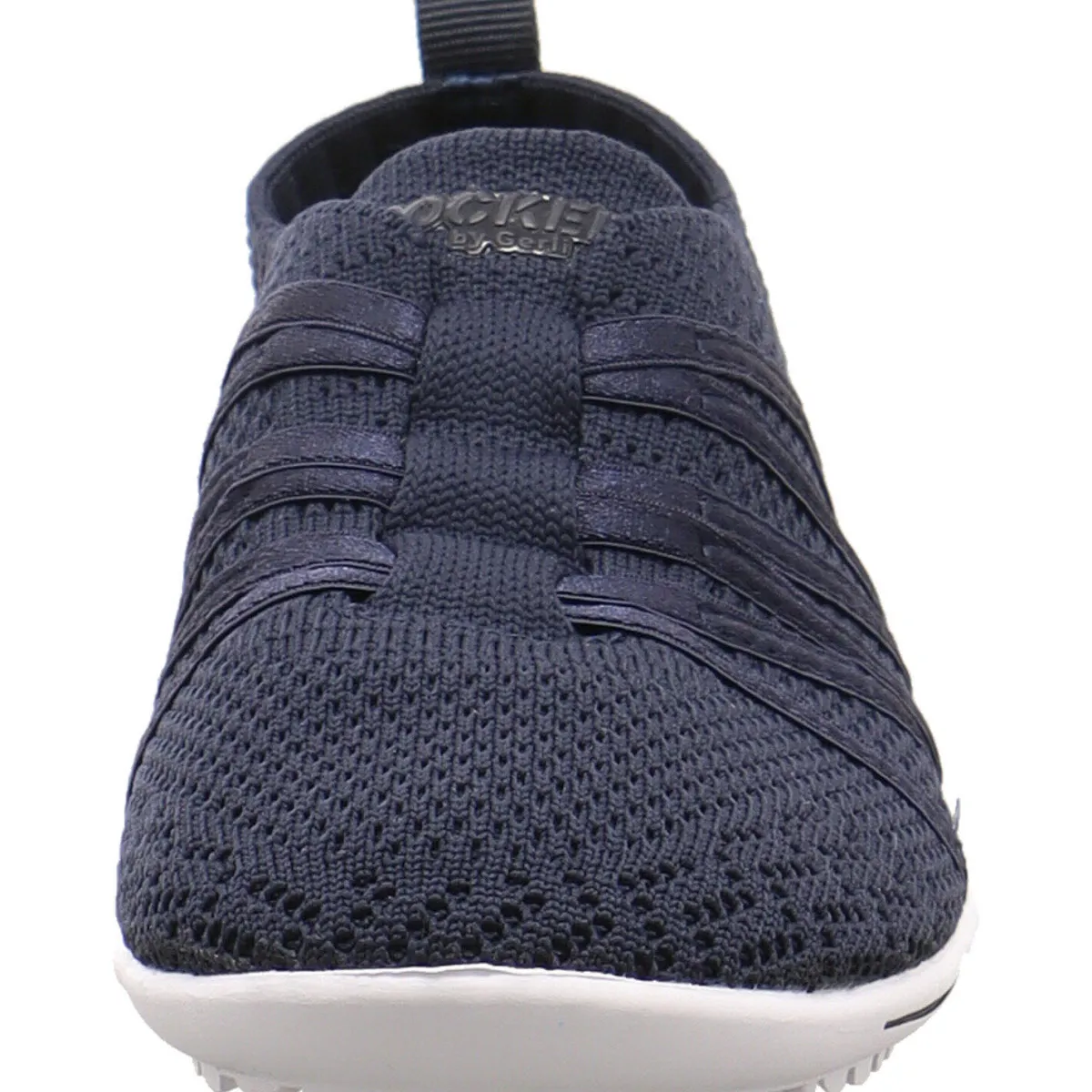 Das Obermaterial aus Textil Mesh in dunklem Blau ist mit stabilisierenden Gummi Einsätzen ausgestattet die optisch eine Schnürung nachahmen. Diese helfen mit dem Band an der Ferse bei einem leichten Einstieg.