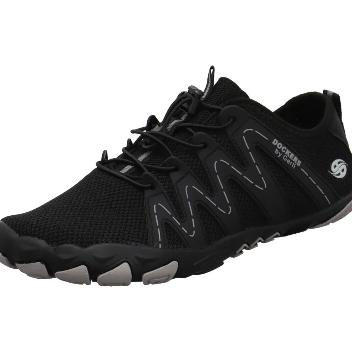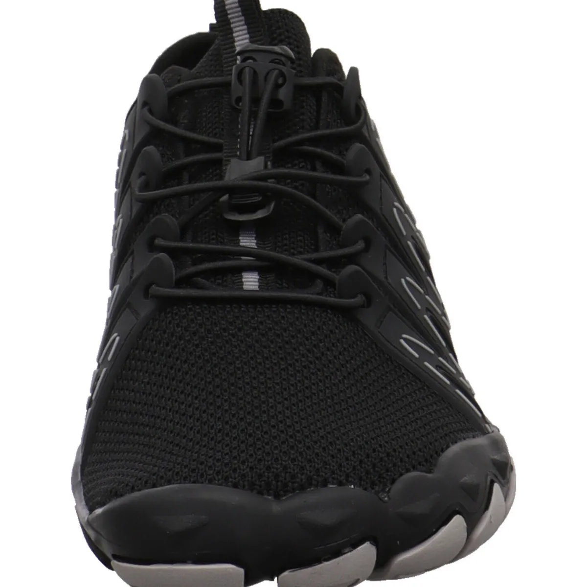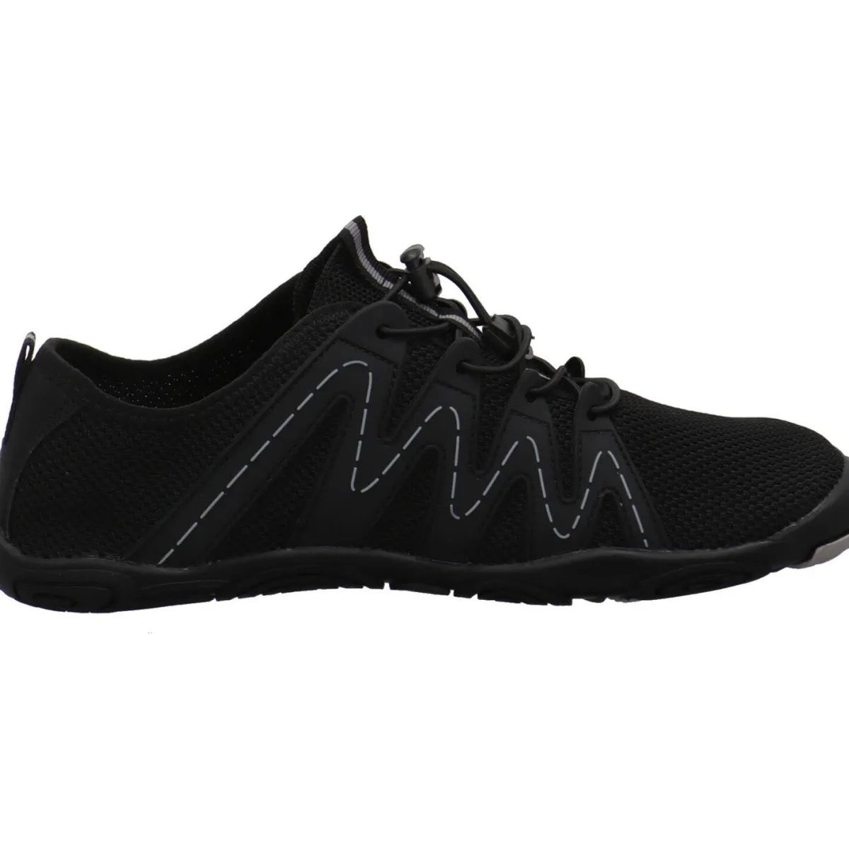 Das Textil Gewebe in Schwarz, ist ausgesprochen flexibel und wird durch die Synthetik Einsätze der Schnürung toll in Szene gesetzt. Durch die automatische Gummischnürung kannst du ihn genau an deinen Fuß anpassen und mit den Laschen am Schaft ist der Einstieg sehr leicht. Der Zehenbereich ist großzügig gearbeitet und bietet deinem Fuß viel Platz und Bewegungsfreiheit. Die Laufsohle ist besonders dünn und flexibel gearbeitet und die Innensohle lässt sich entnehmen. So hast du das optimale Barfuß Gefühl und unterstützt die natürliche Fuß Bewegung.