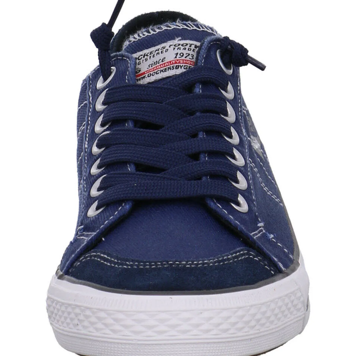 Der aus pflegeleichtem Textil in Blau gefertigte Schnürschuh bietet absoluten Komfort beim Gehen und das textile Innenfutter sorgt für angenehmen Tragekomfort. An der Ferse und Schuhspitze sind Einsätze aus Veloursleder zu finden. Helle Ziernähte und ein Dockers Print runden das sportliche Design gekonnt ab. Die Laufsohle in Weiß verleiht ihm den typischen Sneakerlook. Die Schnürung hilft bei einem leichten Ein- und Ausstieg. Die flexible Gummi Außensohle ist zudem rutschhemmend und ermöglicht einen tollen Laufkomfort.