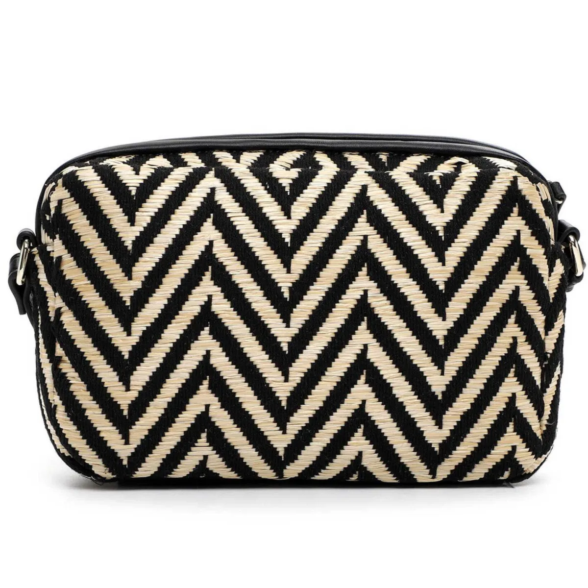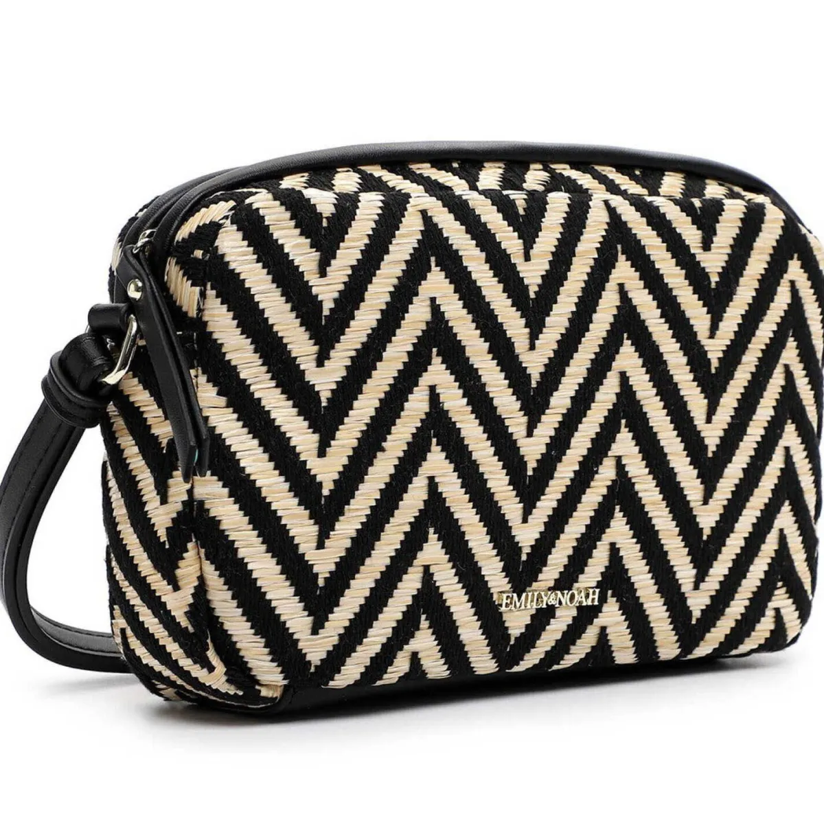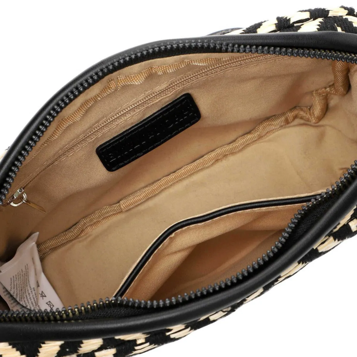 Gefertigt in einem Mix aus Kunstleder und Textil in Schwarz und Taupe Beige, ist sie mit einem schönen Muster versehen. Das kleine kompakte Format bietet Platz für die wichtigsten Dinge.