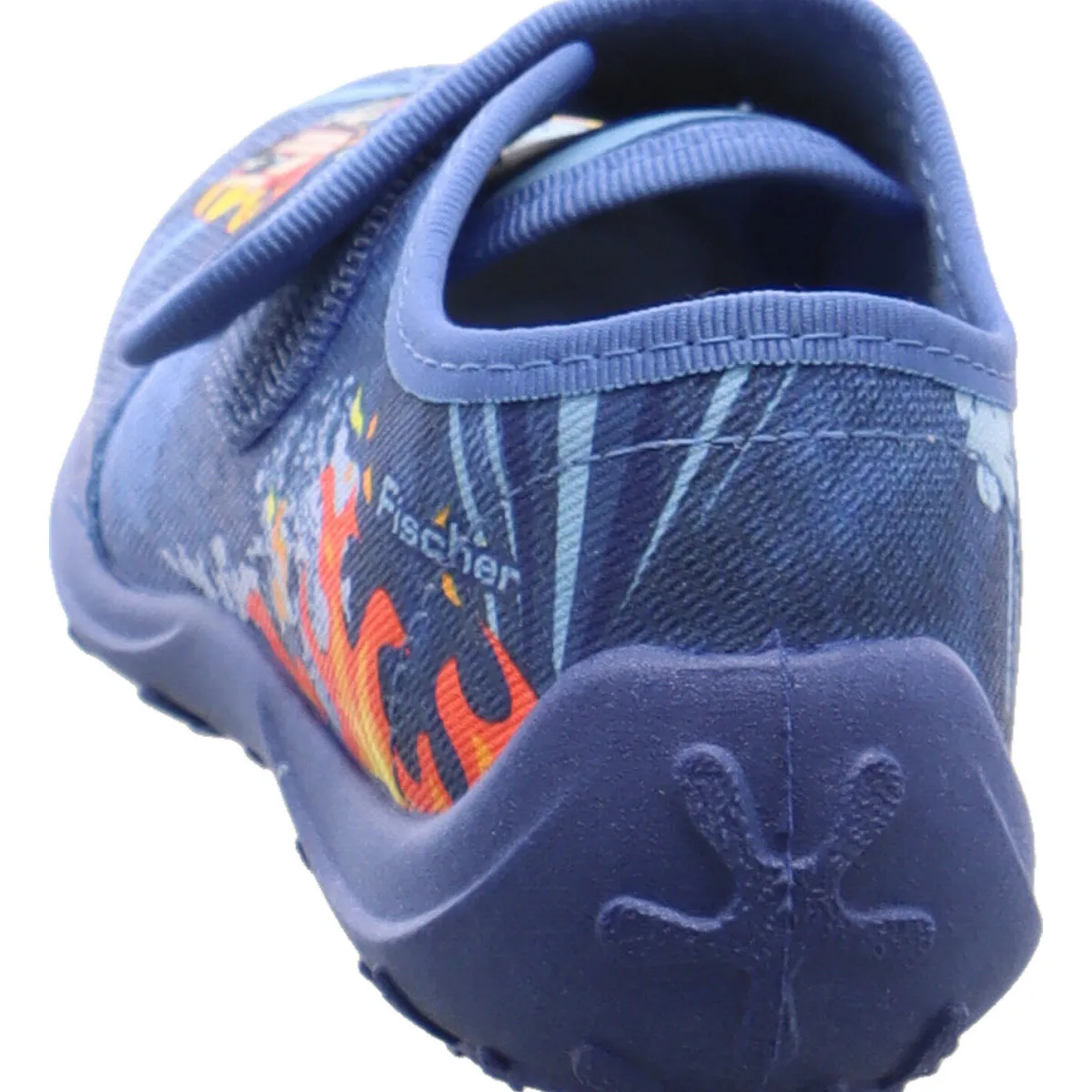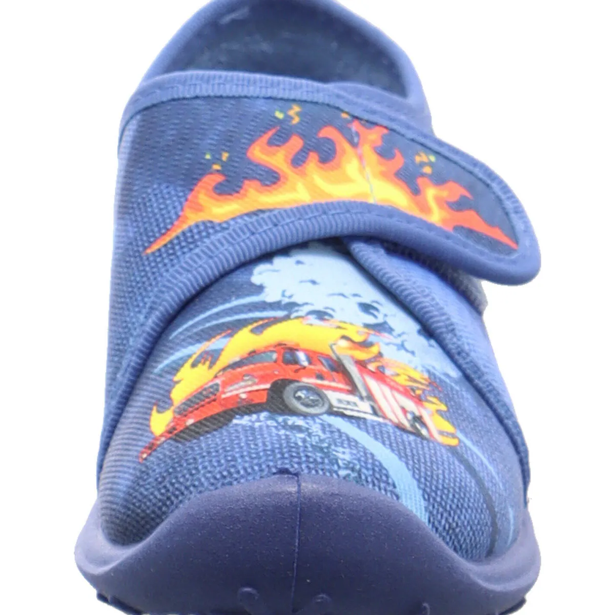 Der Schuh ist aus strapazierfähigem Textil in Blau gefertigt, innen leicht frottiert und sehr leicht. Zudemlässt er sich durch den seitlichen Klettverschluss leicht an- und ausziehen, was beim Spielen oft von Vorteil ist.