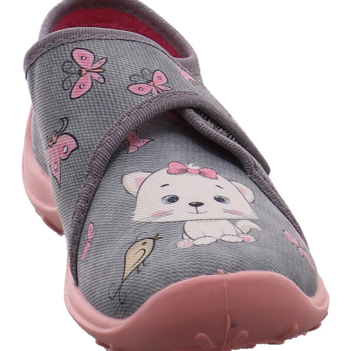 Der Schuh ist aus Textil in Grau gefertigt und sehr leicht. Zudem lässt er sich durch den seitlichen Klettverschluss leicht an- und ausziehen, was beim Spielen oft von Vorteil ist. Die Touch Me Innensohle und das Frottee Innenfutter, sind angenehm weich gepolstert.