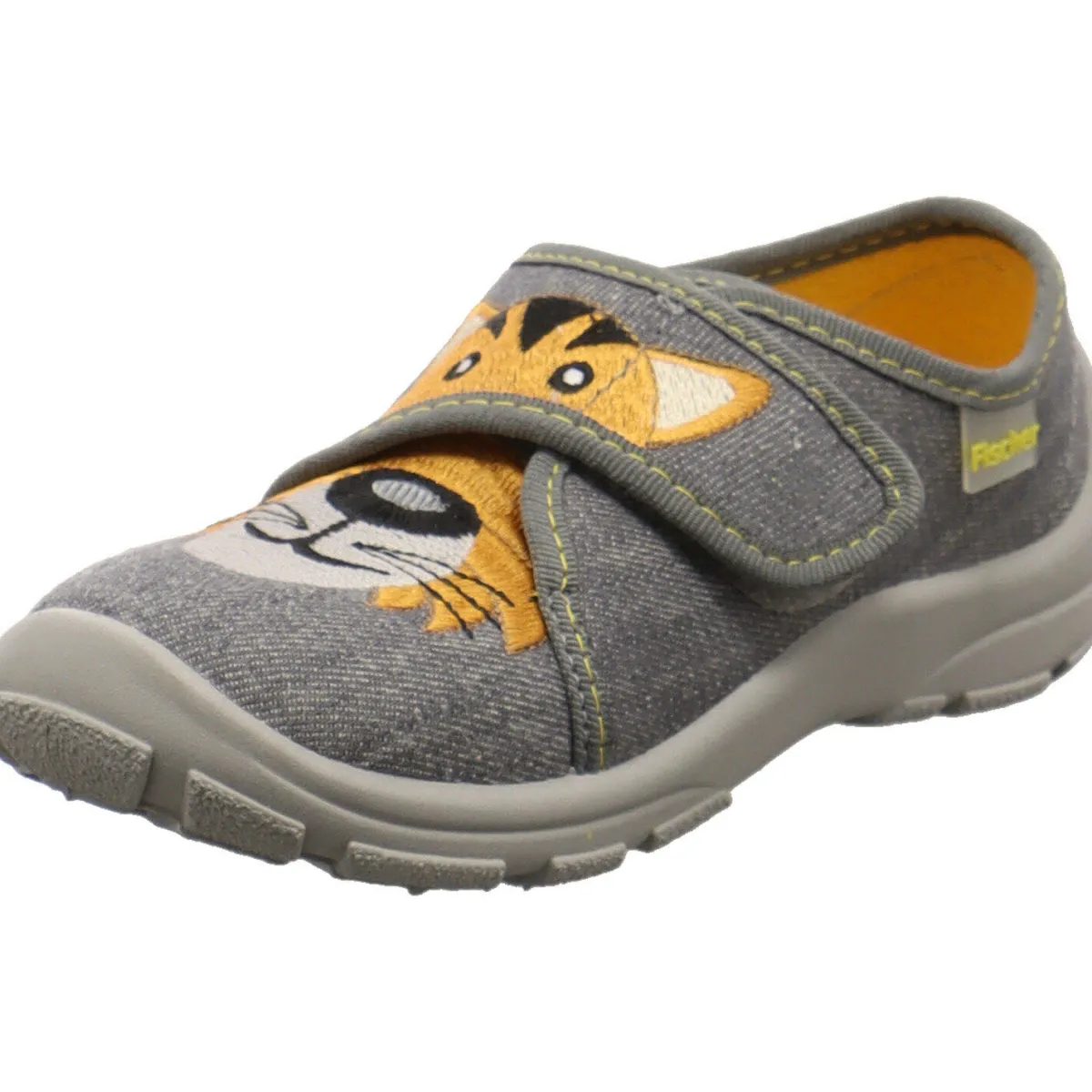 Der Schuh ist aus strapazierfähigem Textil in Grau mit Details in Orange gefertigt, innen leicht frottiert und sehr leicht. Zudem lässt er sich durch den seitlichen Klettverschluss leicht an- und ausziehen, was beim Spielen oft von Vorteil ist.