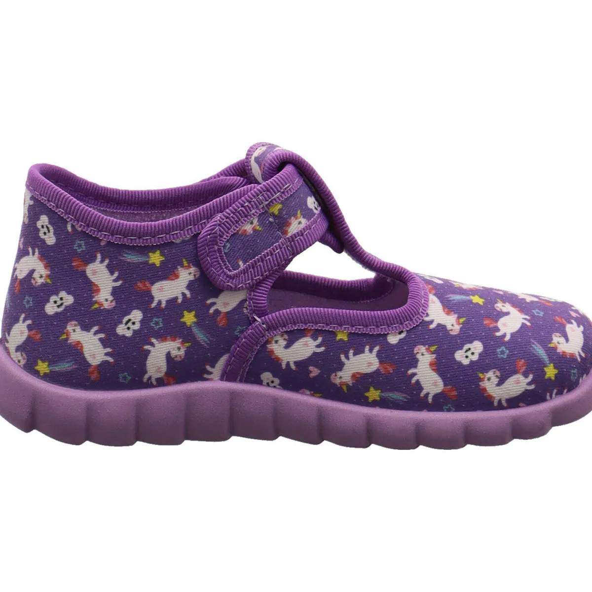 Es wurde aus strapazierfähiger Baumwolle in Lila gearbeitet. Auf dem Blatt ist Allover Print mit kleinen Einhörnern. Durch den seitlichen Klettverschluss ist das An- und Ausziehen ein Kinderspiel. Der leicht erhöhte Schaft gibt den notwendigen Halt. Das Innenfutter ist aus angenehm weichen Frottee Futter gearbeitet. Kleine Cutouts und die Perforierung der Laufsohle sorgen zusätzlich für eine optimale Belüftung. Die Flexi-B Gummilaufsohle ist rutschhemmend und dennoch super flexibel und leicht.