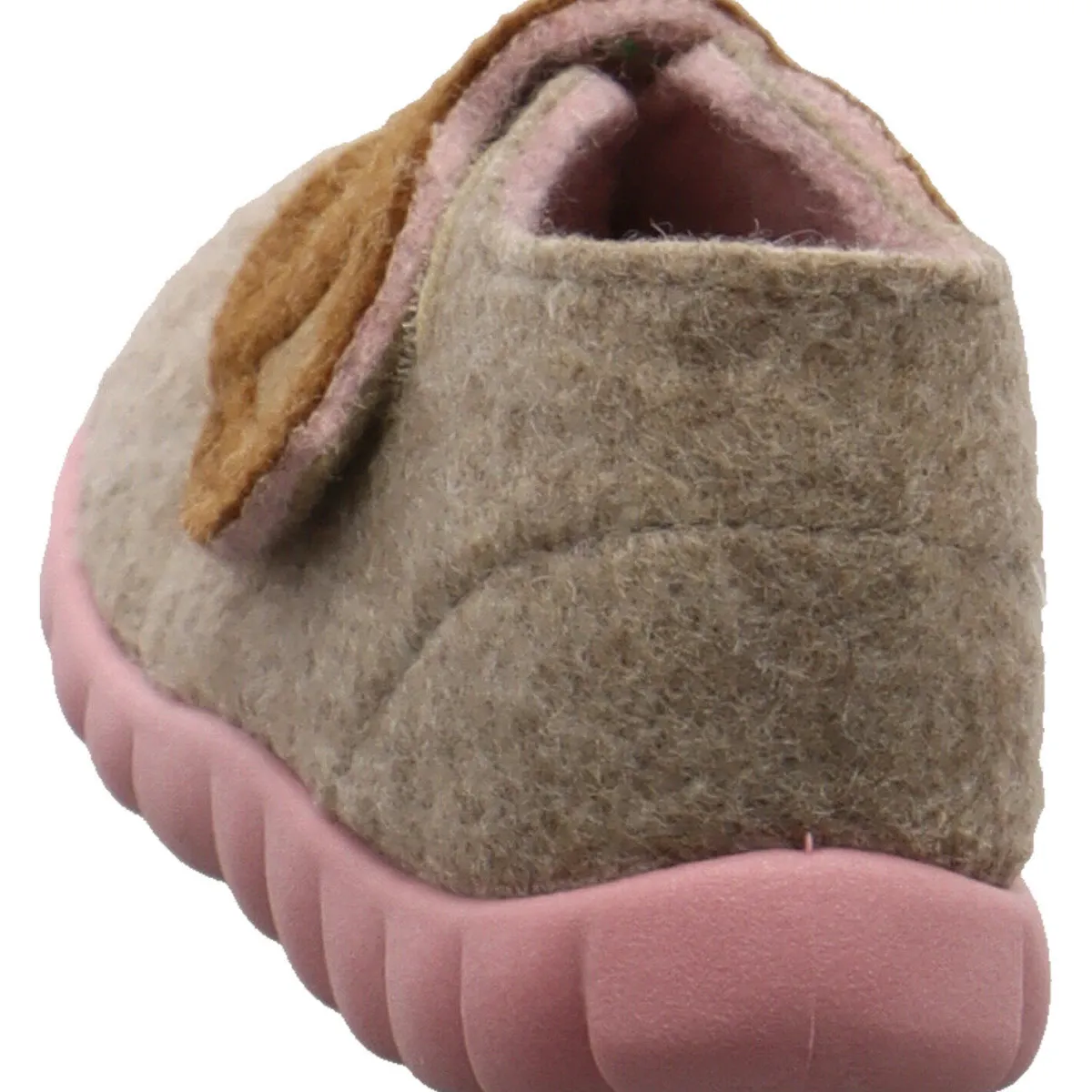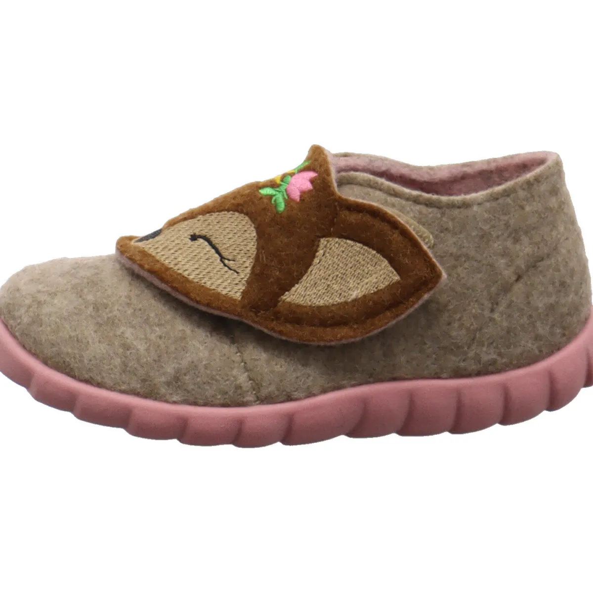 Der Klettverschluss, der unter dem Reh versteckt ist, ermöglicht ein einfaches An- und Ausziehen und die flexible Laufsohle in einem hellen Rosa ist perforiert und dadurch atmungsaktiv.
