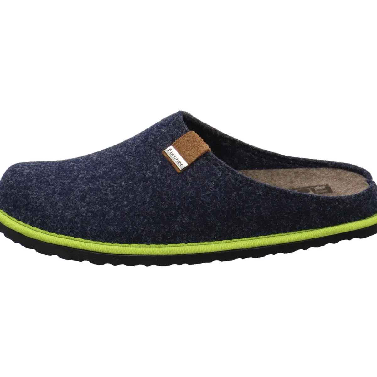 Das Obermaterial aus recyceltem Textil Filz in Marine Blau macht den Schuh robust und langlebig. Hingucker ist dabei, das Textil Band in Neon Grün um die Laufsohle. Die Gummisohle gibt perfekten Halt, so kommst du auch auf glatten Böden nicht ins Rutschen. Durch das Wechselfußbett eignet sich der Hausschuh auch perfekt für lose Einlagen. Der Schuh ist dabei super leicht und flexibel.