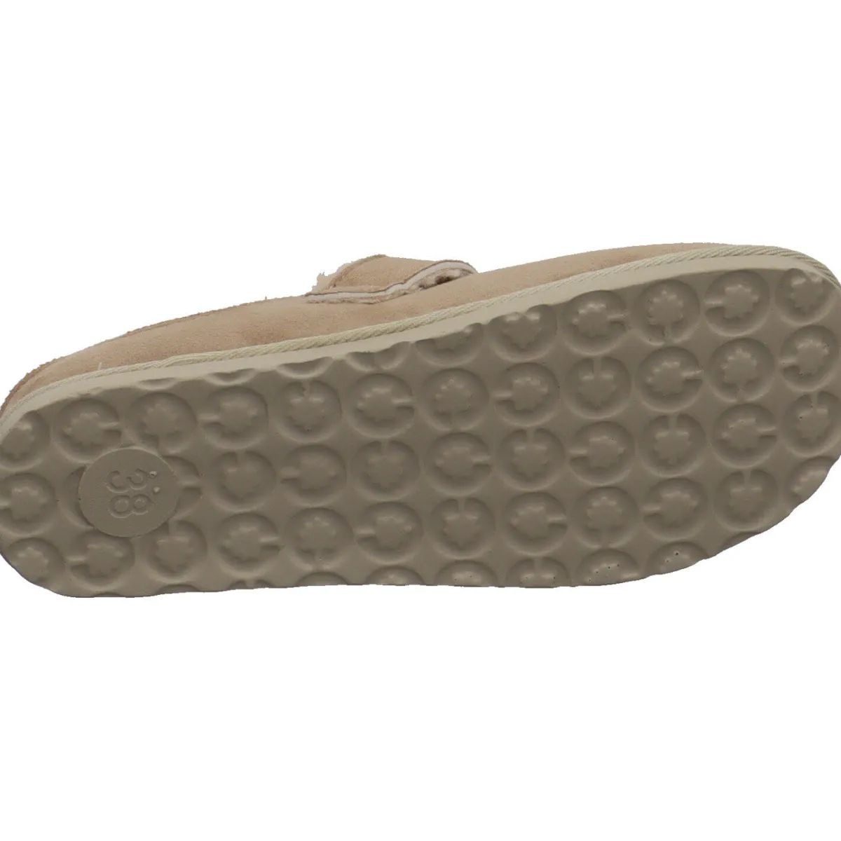 Der wurde aus Textil in Beige in Velouroptik gefertigt und ist mit einem Riemen mit einer schönen Dornschnalle versehen. Diesen Riemen kannst du individuell einstellen. Das Innenfutter ist besonders flauschig und die Filz Innensohle als Wechselfußbett gearbeitet. So können auch eigene Einlagen verwendet werden.