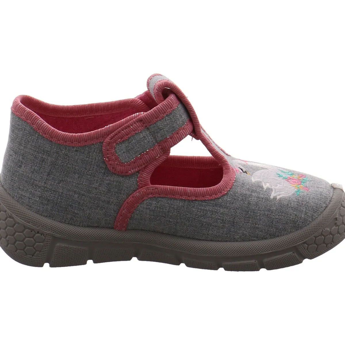 Der Schuh ist aus strapazierfähiger Baumwolle in Grau mit Rosa gefertigt, innen frottiert und sehr leicht. Zudem lässt er sich durch den seitlichen Klettverschluss leicht an- und ausziehen, was beim Spielen oft von Vorteil ist. Die seitlichen Cutouts sorgen zusätzlich für ein gutes Fußklima. Die Touch Me Decksohle ist extra gepolstert um ein angenehmes Tragen zu gewährleisten.