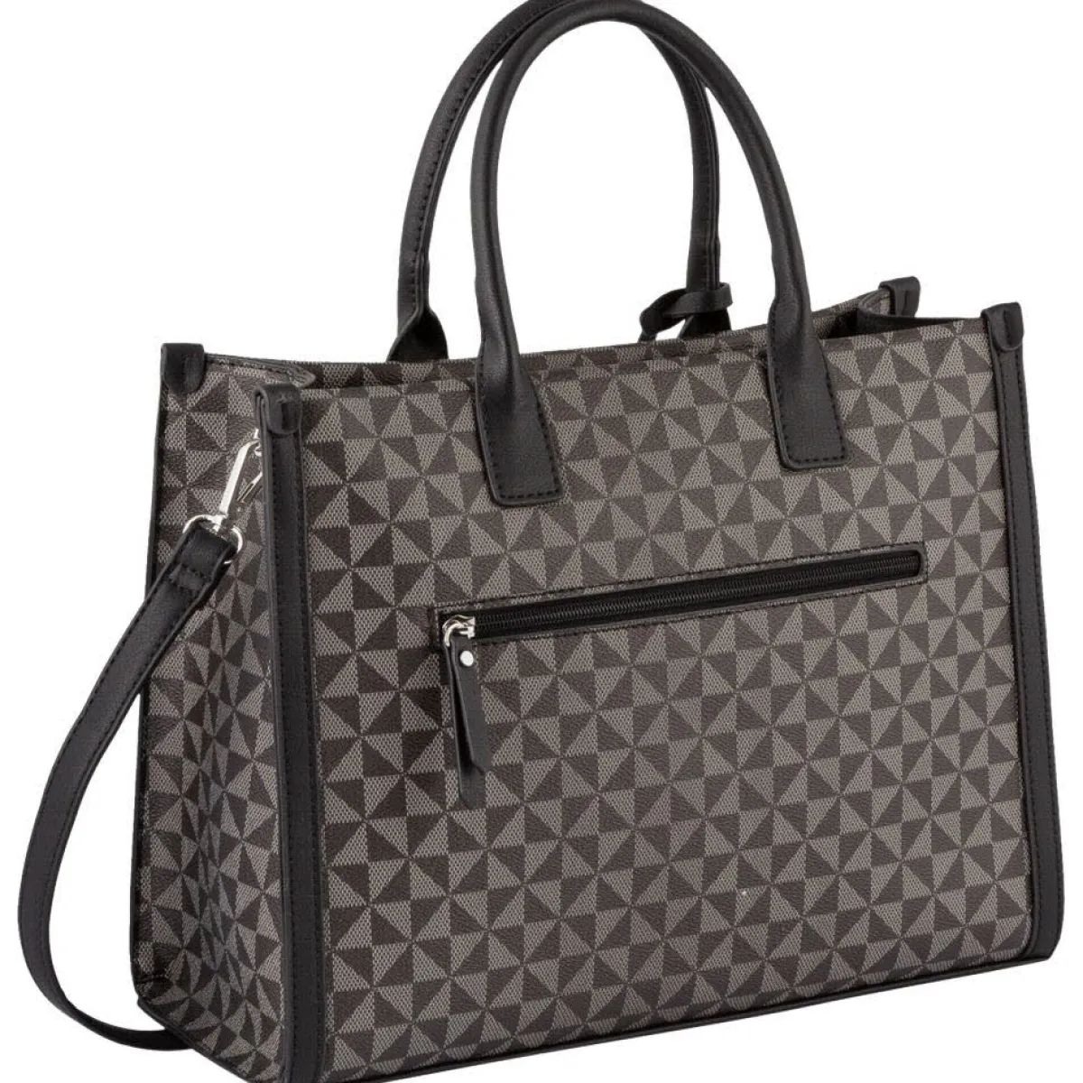 Die Handtasche wurde aus pflegeleichtem Kunstleder in Schwarz und Braun gefertigt und mit einem grafischen Allover Print versehen. Die Tasche ist durch ihr stilvolles Design ein besonderer Blickfang und begleitet dich besonders edel in der Freizeit und ins Büro.