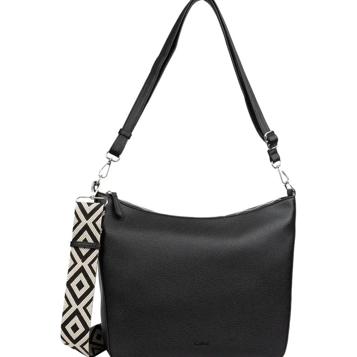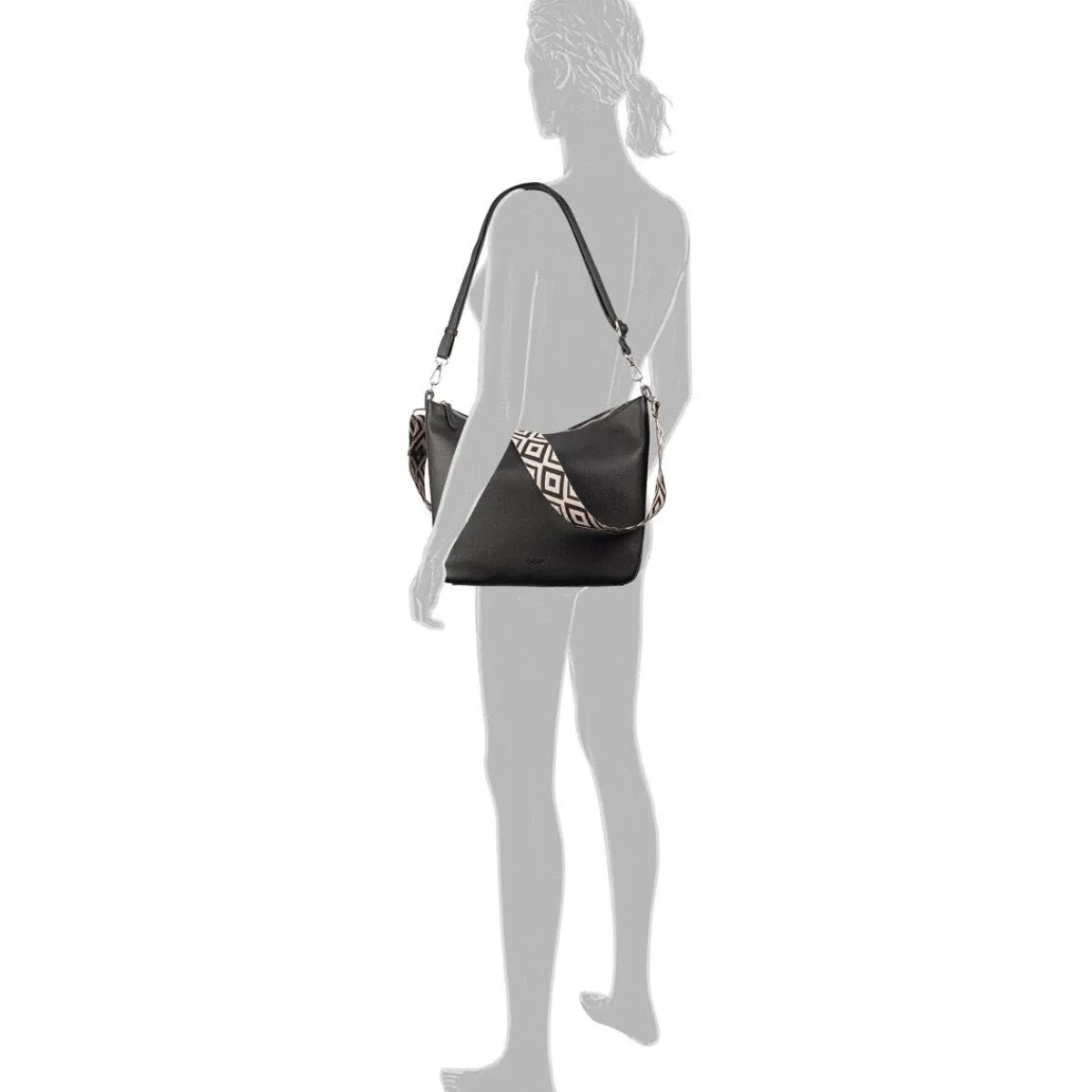 Der Umhängegurt ist mit einem grafischen Muster versehen und der mitgelieferte Tragehenkel in Schwarz ermöglicht auch ein Crossover Tragen der Handtasche.