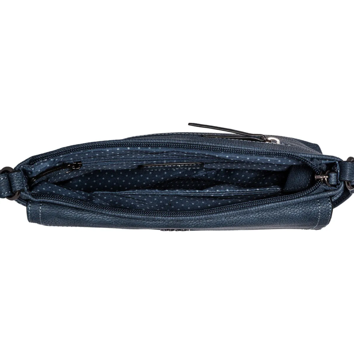 Hingucker sind das metallische Marken Logo, die Ziernähte auf dem grob genarbten Kunstleder und das Innenfutter mit Punkte Muster. Das praktische Format der Handtasche bietet Platz für alles, was Sie beim Stadtbummel dabei haben möchten oder was Sie im Alltag begleiten soll.