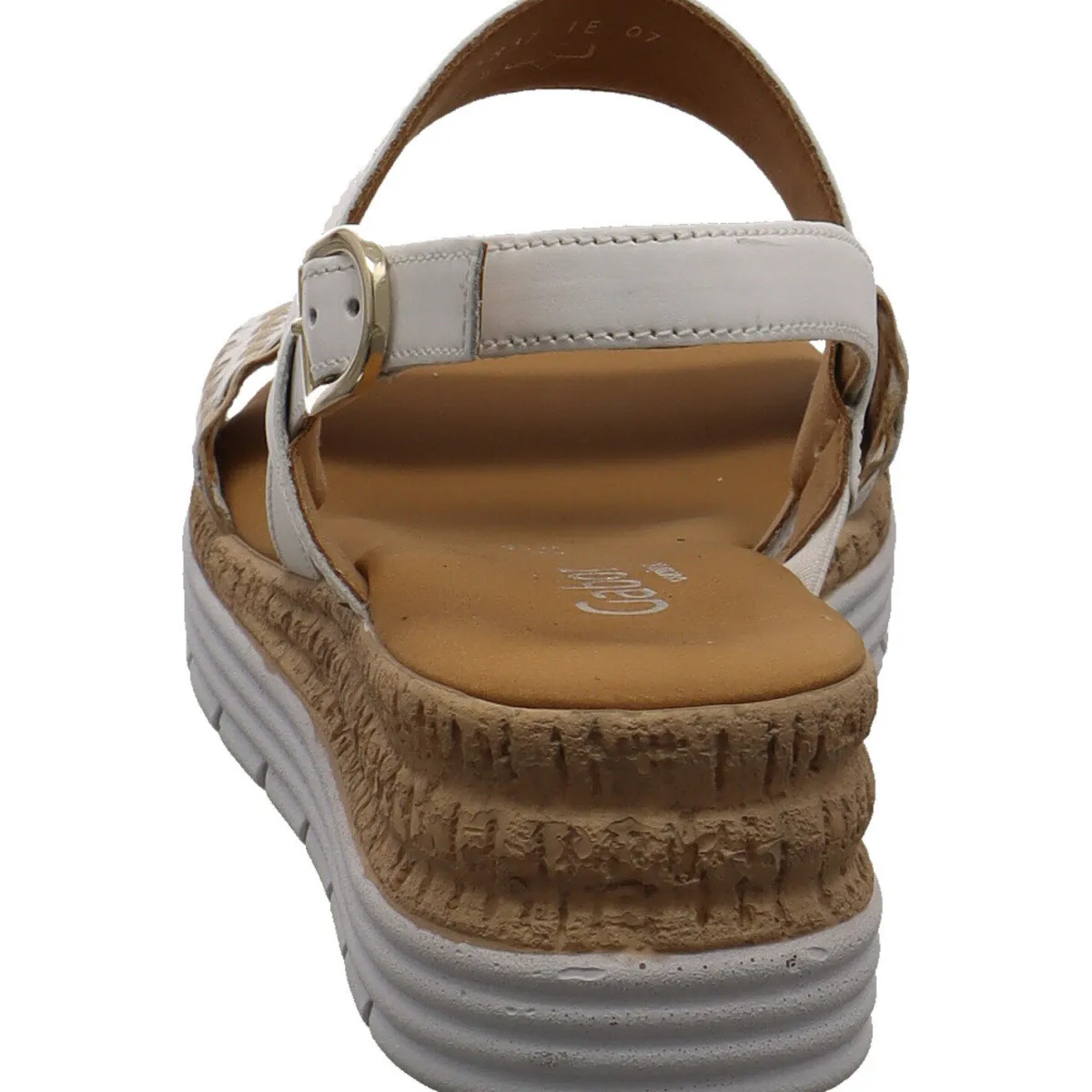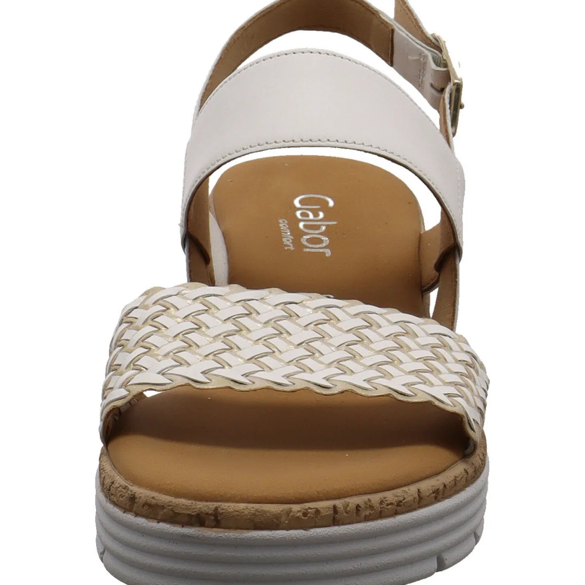 Sie wurde aus Echtleder in Weiß gefertigt. Der vordere Riemen ist hierbei mit einem schönen Web Muster in Weiß mit Gold gearbeitet. Der Fersenriemen hat einen dezenten Dehngummi und eine Schnalle zum verstellen. So kommst du ganz leicht in den Schuh und kannst ihn auf deine Bedürfnisse anpassen.