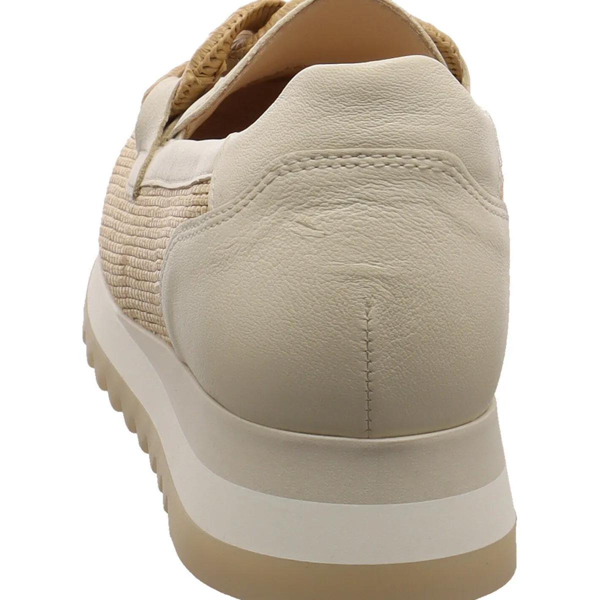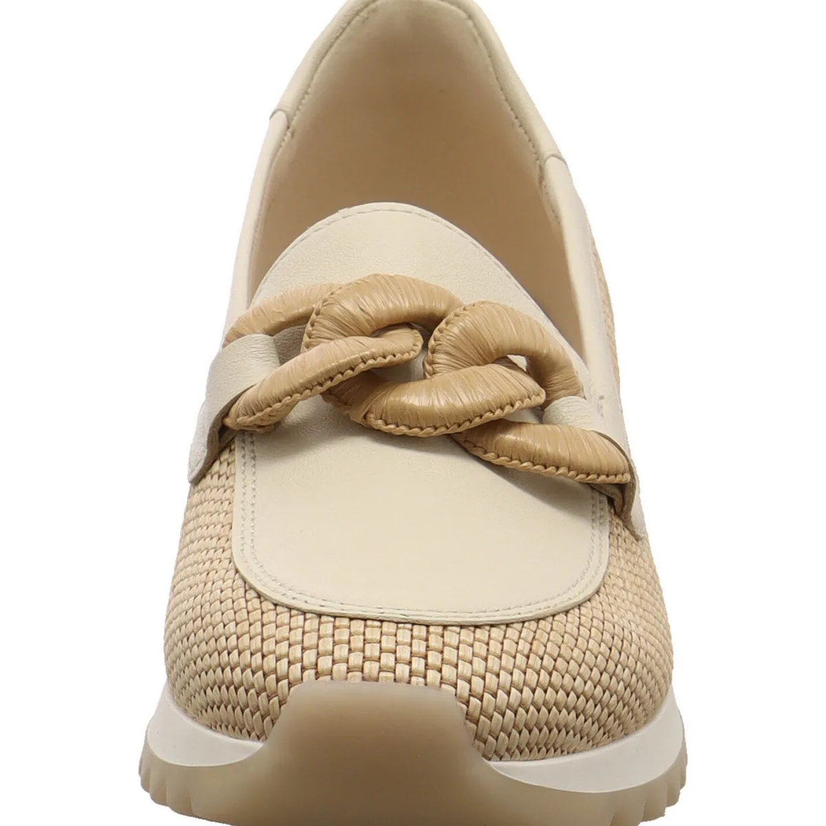 Gefertigt aus einem tollen Mix aus Echtleder und Synthetik in Beige, begeistert er uns durch die verschiedenen Haptiken. Ein Hingucker ist die Gliederkette über dem Rist. Die Rückseite vom Schaft ist höher gearbeitet und bietet einen tollen Tragekomfort.