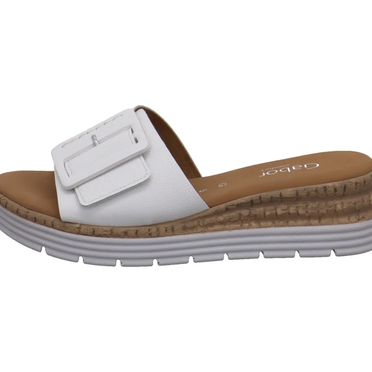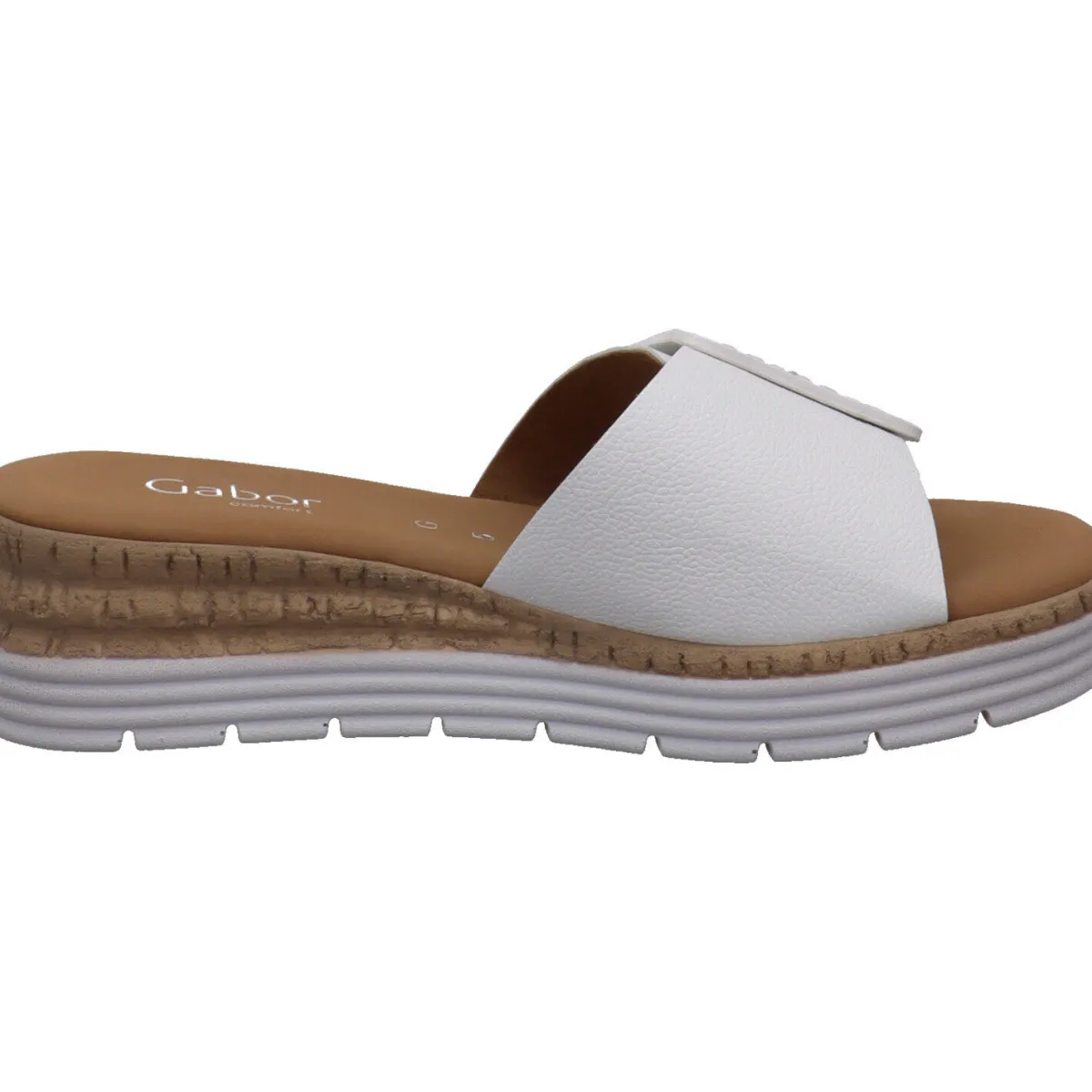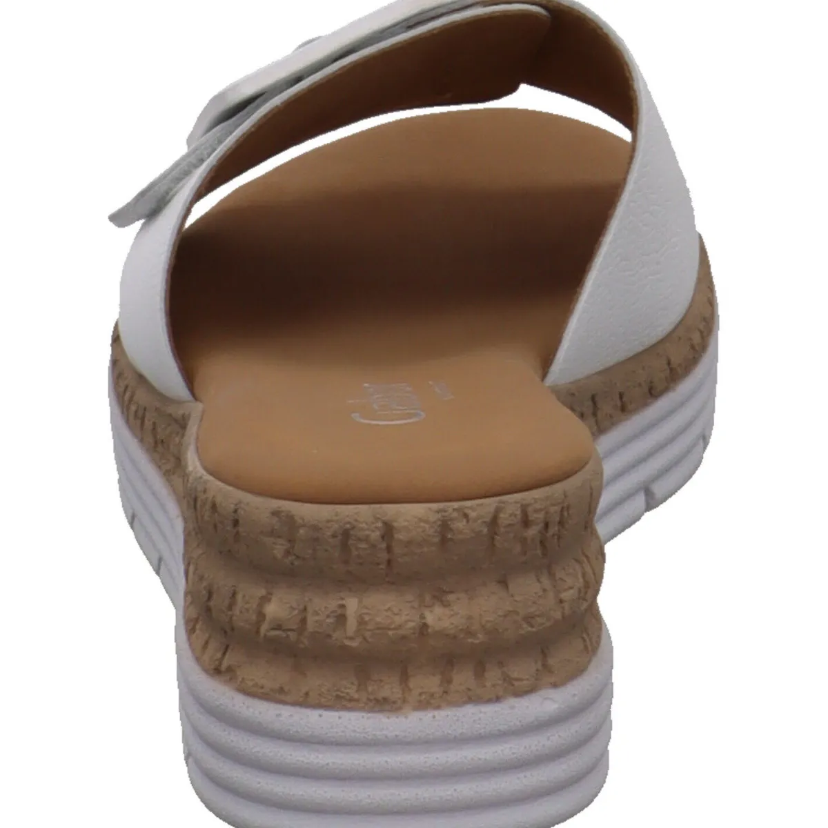 Gefertigt aus hochwertigem Glattleder in klassischem Weiß, ist der Riemen mit einem Klettverschluss und einer Zierschnalle versehen. So kannst du ihn genau auf deinen Fuß anpassen. Der schöne Keilabsatz zaubert er lange Beine. Der Eyecatcher ist dabei der Absatz mit seiner Kork Optik und der Umrandung in Weiß.