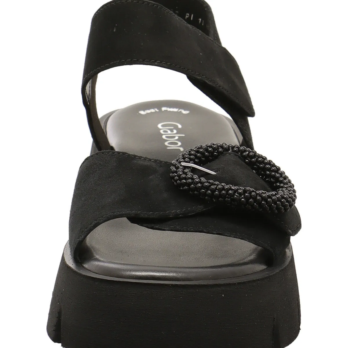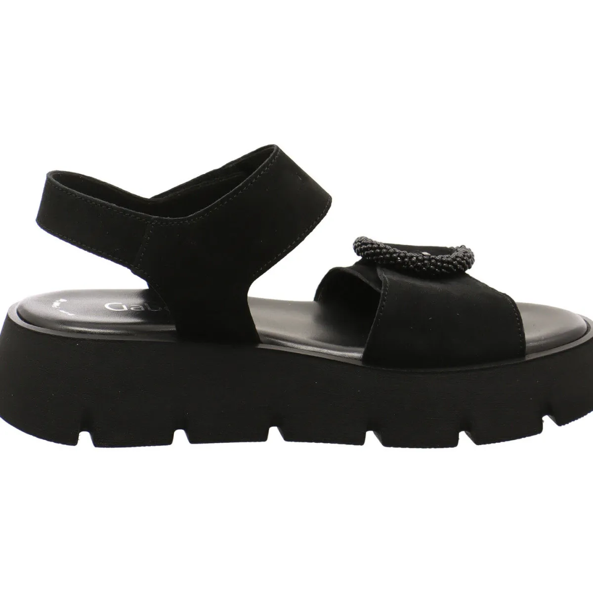 Sie wurde aus hochwertigem Echtleder in Schwarz gearbeitet. Der vordere Riemen ist mit einer Zierschnalle versehen und der Knöchelriemen hat einen Klettverschluss. Dadurch ist der Einstieg ganz einfach.