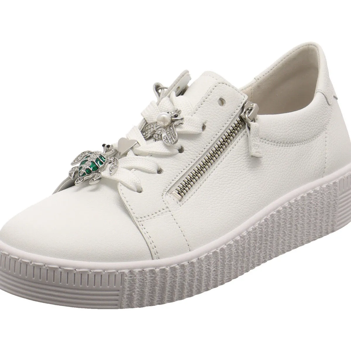 Mit dem doppelten Reißverschluss ist der Einstieg ganz einfach. Die Eyecatcher an diesem Modell sind jedoch die kleinen Metall Applikationen auf der Schnürung. So findest du eine kleine Schildkröte, ein Herz und eine Biene in Silber. Diese sind mit viel Liebe zum Detail gestaltet und machen den Schuh zu etwas Besonderem.