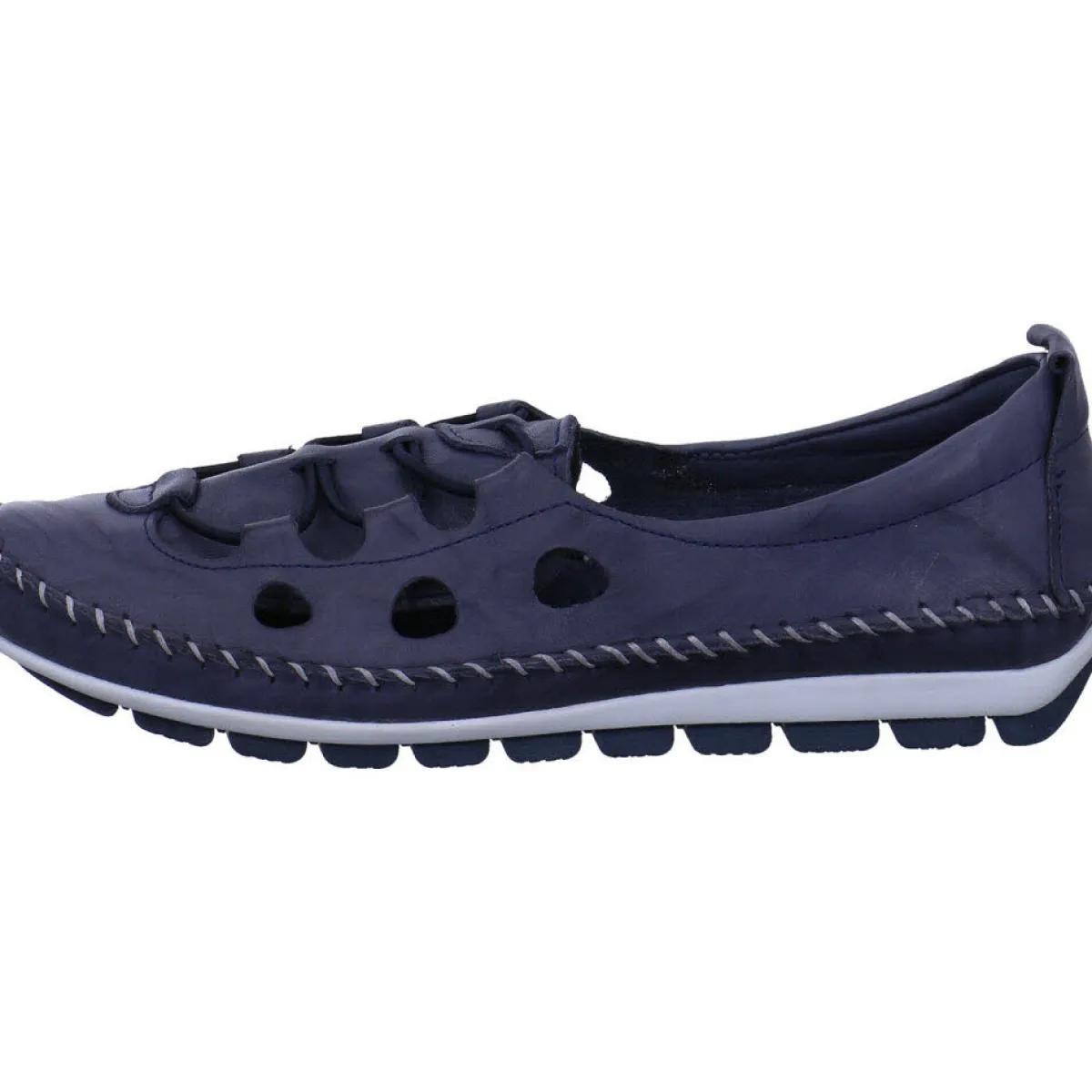 Das Obermaterial aus hochwertigem weichen Echtleder in Blau ist mit einer Ziernaht in Weiß umrandet und verleiht dem Schuh einen sportlichen Look. Ein weiteres Highlight sind die Gummischnürung und die seitlichen Cutouts.