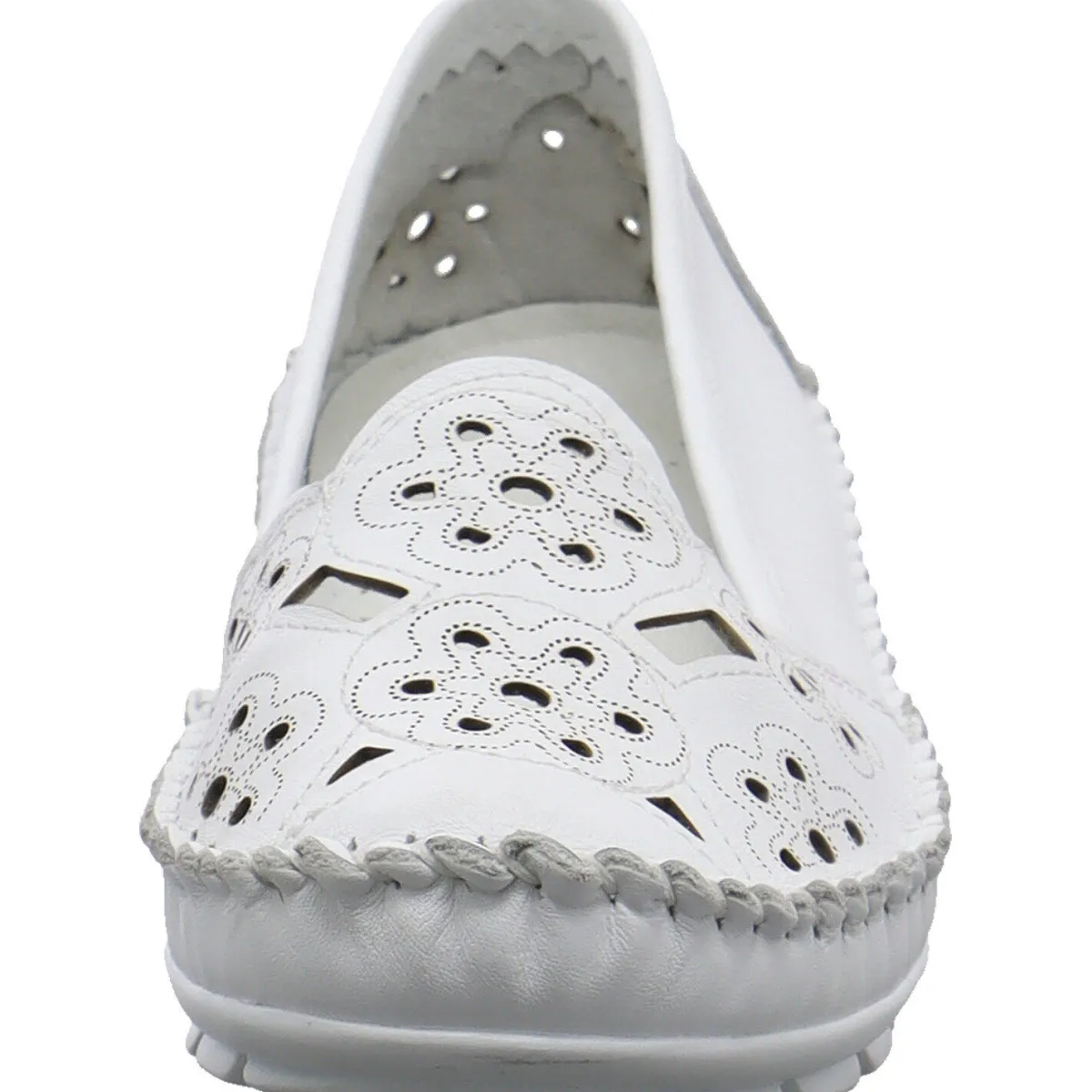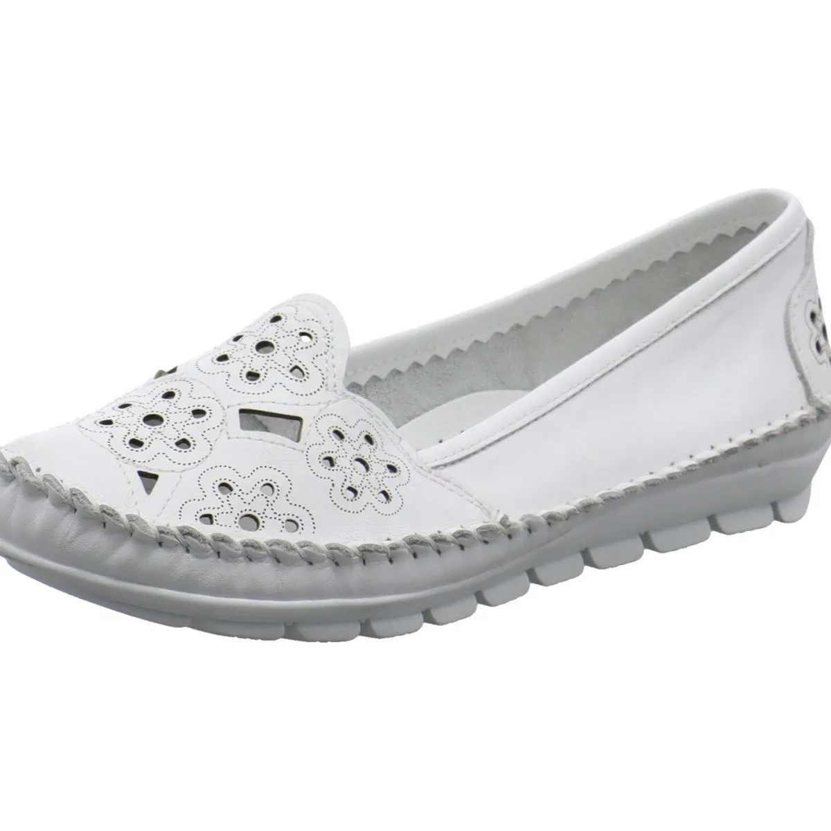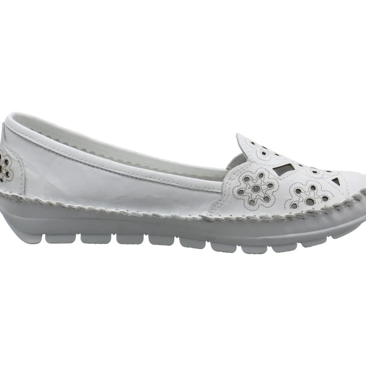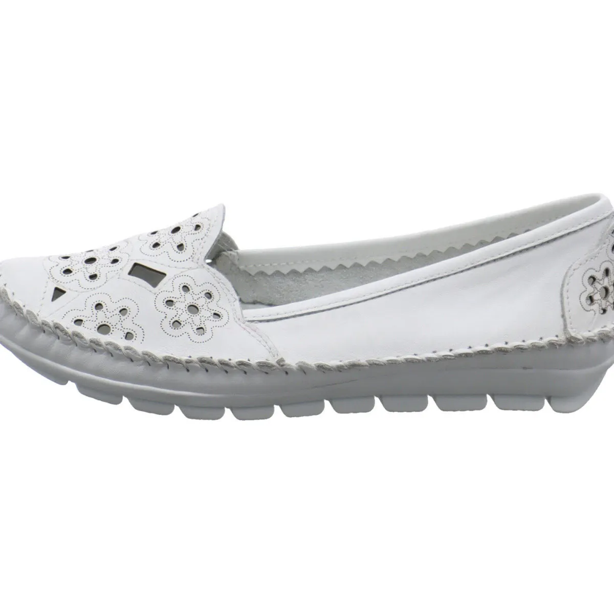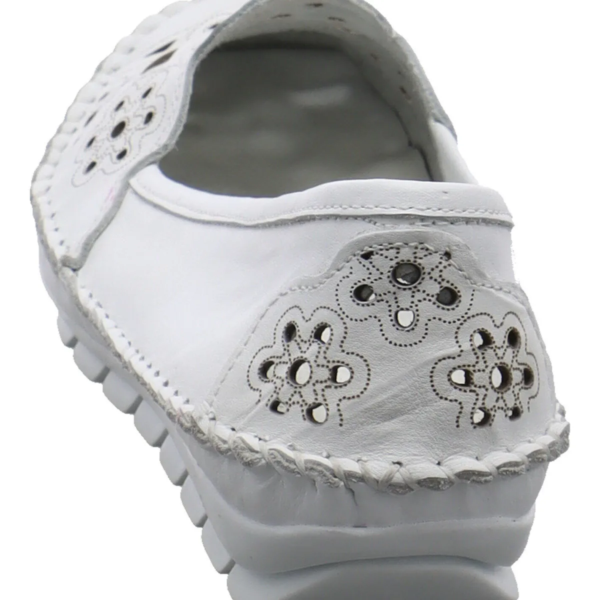 Das Obermaterial aus hochwertigem weichen Echtleder in Weiß ist mit einer Ziernaht umrandet und mit Cutouts, sowie einem Blumen Muster versehen.