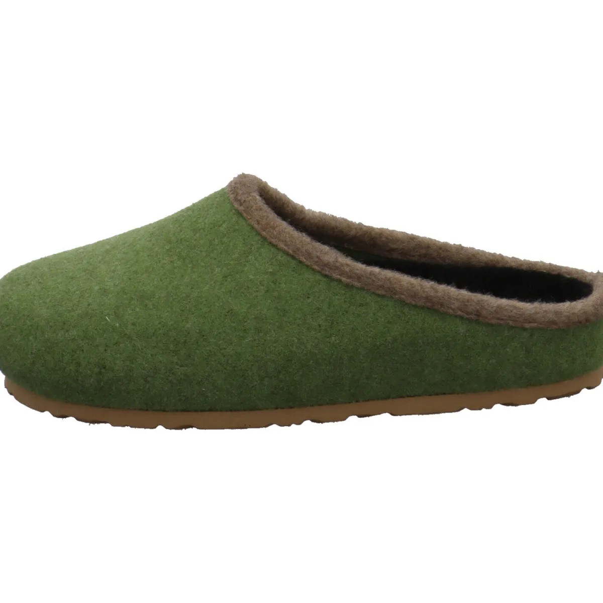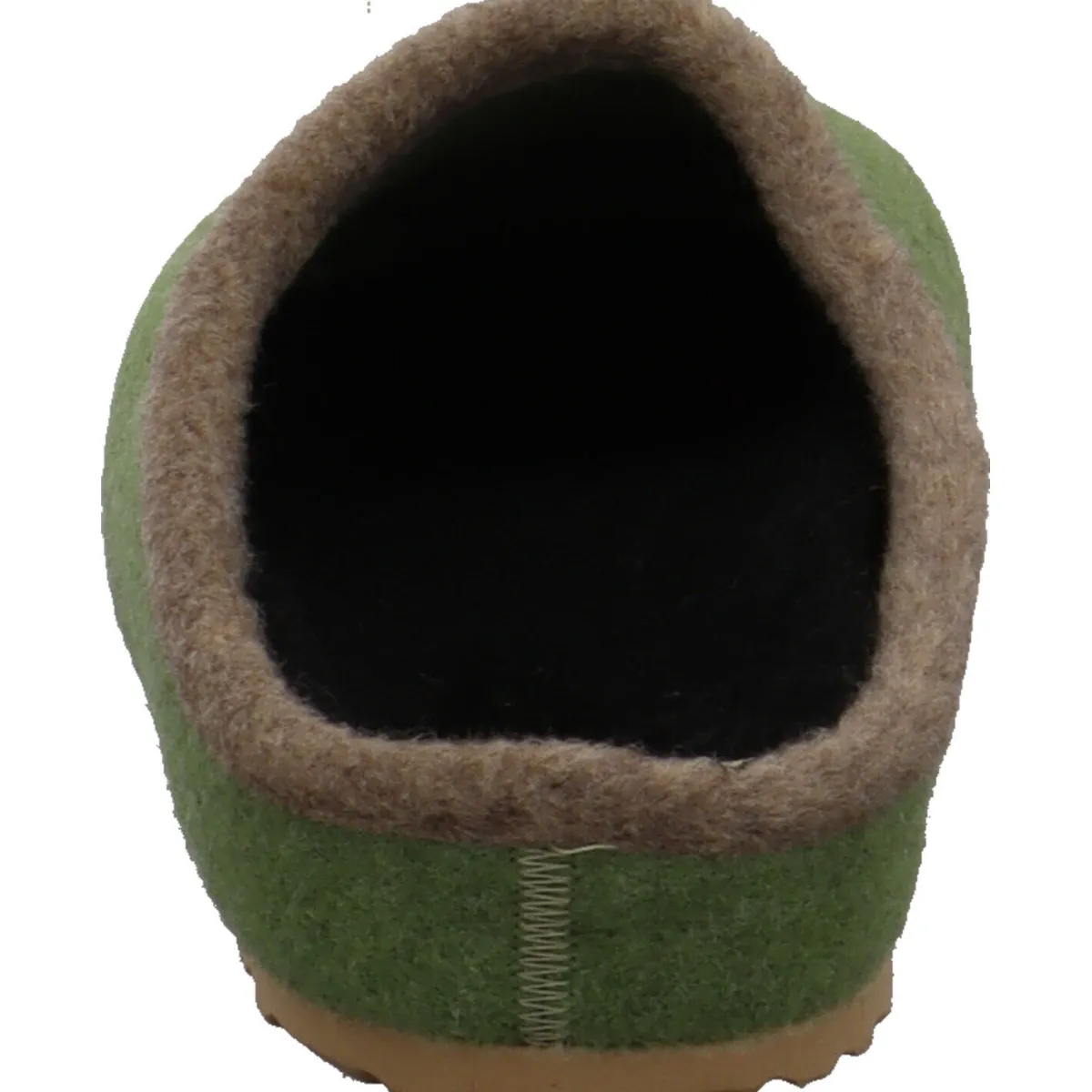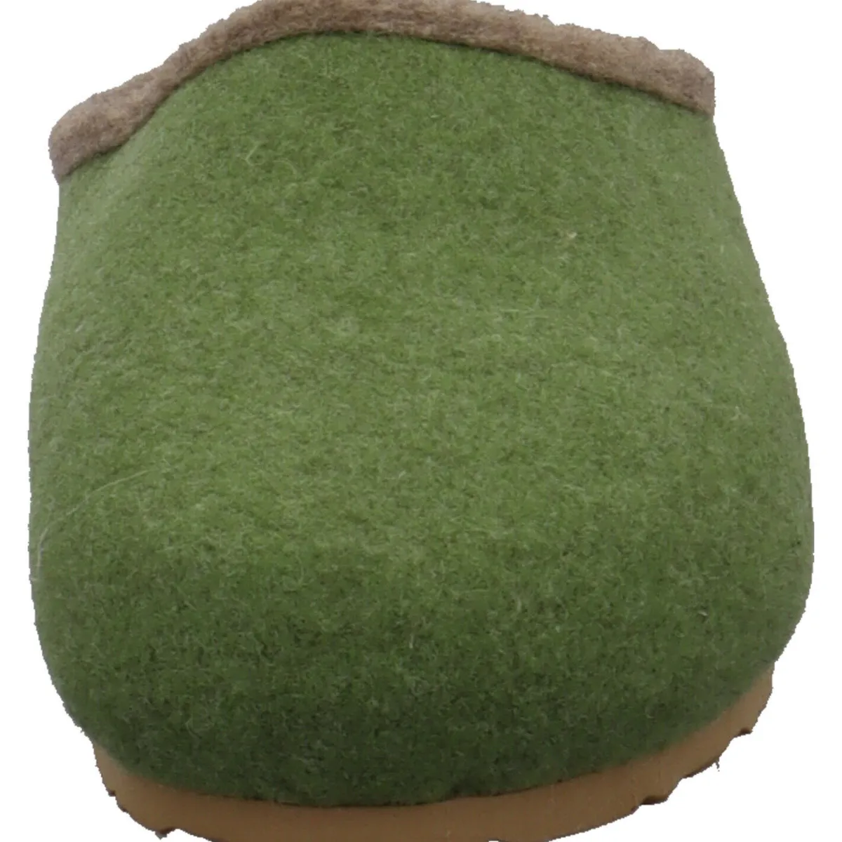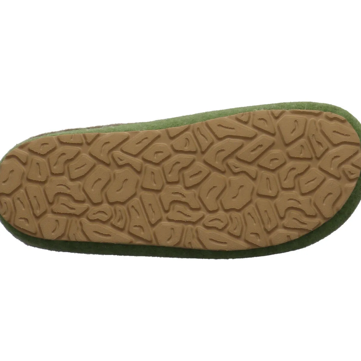 Das Obermaterial aus Filz Schafwolle in Grün ist temperaturausgleichend und robust. Die Synthetiksohle gibt guten Halt, so kommst du auch auf glatten Böden nicht ins Rutschen. Durch das Wechselfußbett eignet sich der Hausschuh auch perfekt für lose Einlagen. Der Schuh ist dabei super leicht.